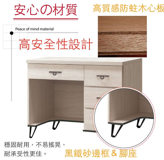材質 | ◆產品名稱:【綠家居】 洛沃 時尚3.5尺四抽書桌 尺寸:(寬)106x(深)58x(高)82/公分 ◆材質: 材質:防蛀木心板+五金滑軌結構+防鏽黑漆腳座 |