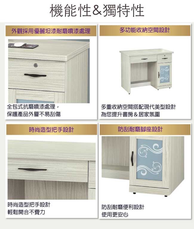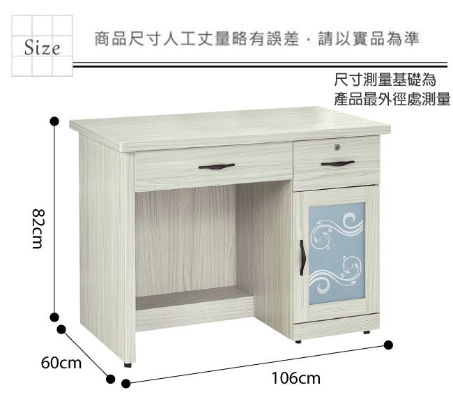 材質 | ◆產品名稱: 【綠家居】歐爾 時尚3.5尺二抽單門書桌 尺寸:(寬)106x(深)60x(高)82/公分 ◆材質: 材質:防蛀木心板+防潮耐磨腳座+五金滑軌結構 噴漆:防潮耐磨噴漆處理