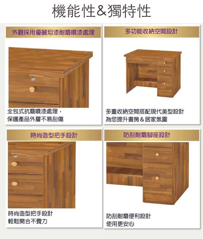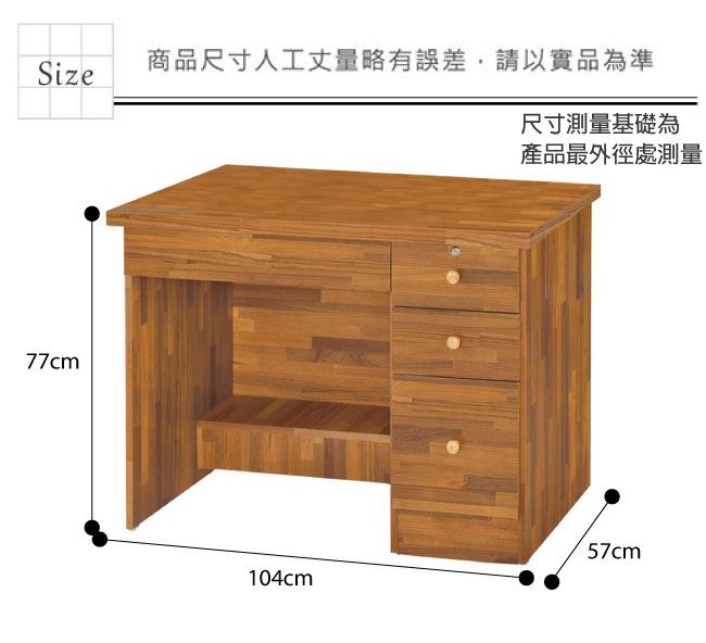 材質 | ◆產品名稱: 【綠家居】歐爾文 時尚3.5尺四抽書桌 尺寸:(寬)104x(深)57x(高)77/公分 ◆材質: 材質:防蛀木心板+防潮耐磨腳座+五金滑軌結構 噴漆:防潮耐磨噴漆處理