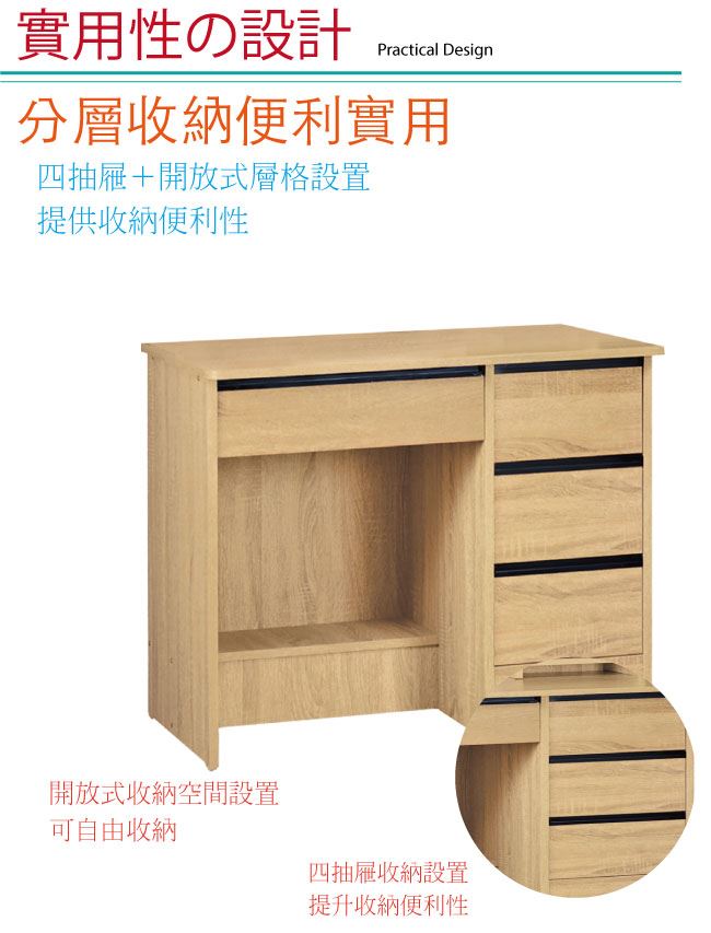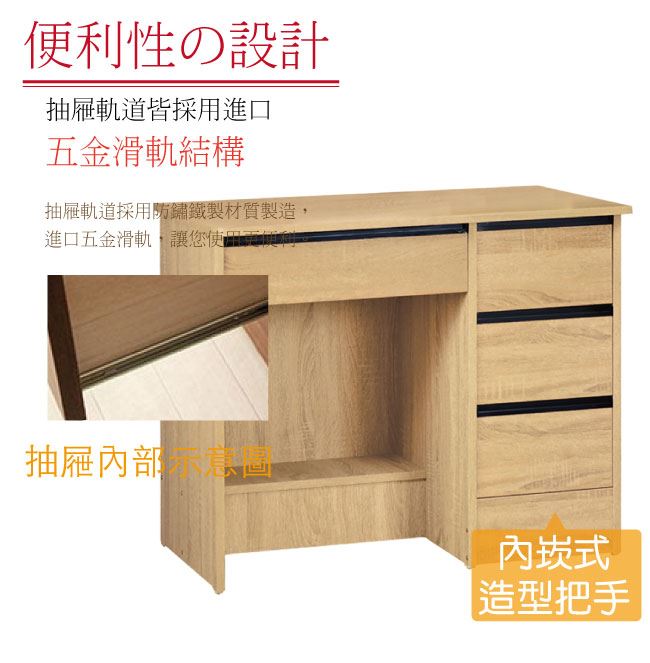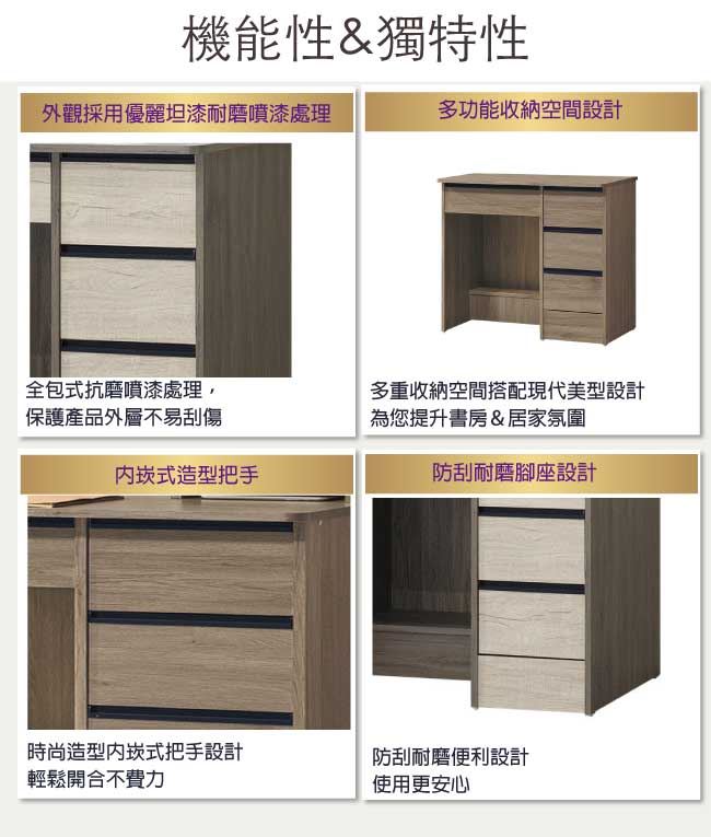 商品介紹 | 【綠家居】特爾 時尚3尺鋁條四抽書桌(三色可選) 三色可選+現代簡約風格+安心材質製造,整體採用防蛀木心板+防潮耐磨腳座+五金滑軌結構+鋁製抽屜黑色邊條等安心材質製造,產品外層採用防潮耐磨噴漆處理搭配採用四抽屜+開放式收納等收納空間設計,全由專人配送到家,專業安心服務,替你省下更多時間! 【商品特色】 三色可選+現代簡約風格+安心材質製造,使用放心+搭配居家更便利 採用防蛀木心板+防潮耐磨腳座+五金滑軌結構+鋁製抽屜黑色邊條等安心材質製造 產品外層採用防潮耐磨噴漆處理 搭配採用四抽屜+開放式收納等收納空間設計 此商品不需要DIY組立,此商品為組立後之成品 品質保證、專業設計、貼心服務 全由專人配送到家,專業安心服務,替您省下更多時間 |