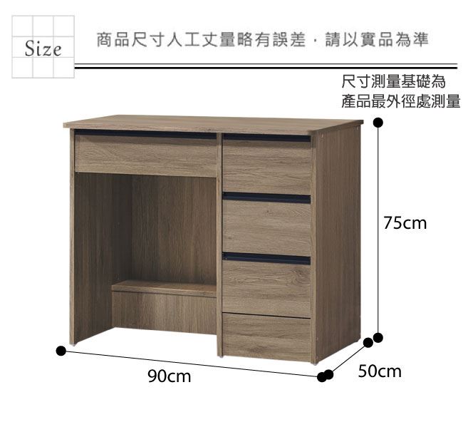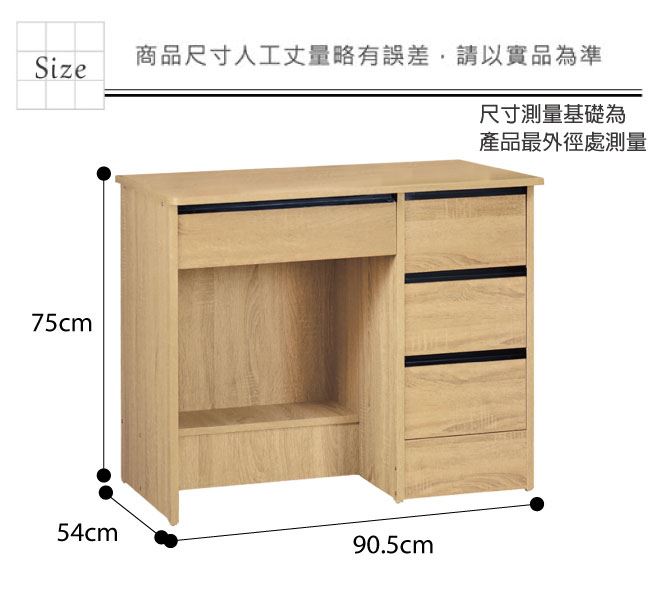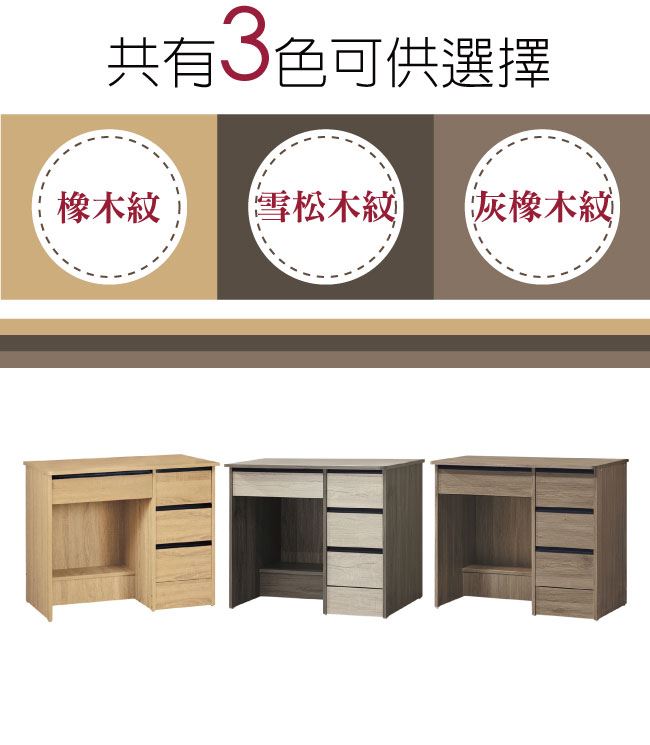 材質 | ◆產品名稱: 【綠家居】特爾 時尚3尺鋁條四抽書桌(三色可選) 灰橡&雪松尺寸:(寬)90x(深)50x(高)75/公分 橡木紋尺寸:(寬)90.5x(深)54x(高)75/公分 ◆材質: 材質:防蛀木心板+防潮耐磨腳座+五金滑軌結構+鋁製抽屜黑色邊條 噴漆:防潮耐磨噴漆處理