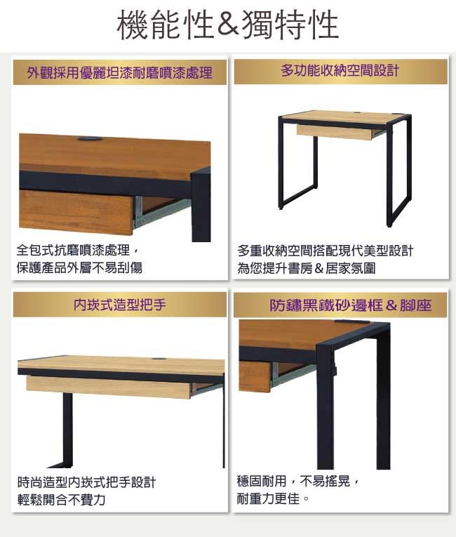 商品介紹 | 【綠家居】英特爾 時尚3.3尺單抽邊框書桌(二色可選) 二色可選+現代簡約風格+安心材質製造,整體採用防蛀木心板+黑鐵砂邊框&腳座+五金滑軌結構等安心材質製造,產品外層採用防潮耐磨噴漆處理搭配採用單抽屜+開放式收納等收納空間設計,全由專人配送到家,專業安心服務,替你省下更多時間! 【商品特色】 二色可選+現代簡約風格+安心材質製造,使用放心+搭配居家更便利 採用防蛀木心板+黑鐵砂邊框&腳座+五金滑軌結構等安心材質製造 產品外層採用防潮耐磨噴漆處理 搭配採用單抽屜+開放式收納等收納空間設計 此商品不需要DIY組立,此商品為組立後之成品 品質保證、專業設計、貼心服務 全由專人配送到家,專業安心服務,替您省下更多時間 |