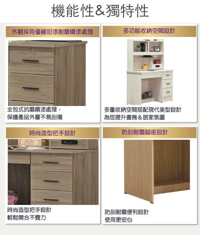 材質 | ◆產品名稱: 【綠家居】萊瑞 時尚3.5尺四抽書桌組合(三色可選) 產品尺寸: 尺寸:(寬)105x(深)57x(高)153/公分 ◆材質: 材質:防蛀木心板+防潮耐磨腳座 材質:五金滑軌結構 塗漆:優利坦全包式耐磨噴漆處理