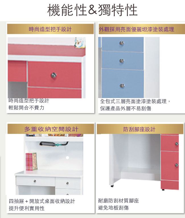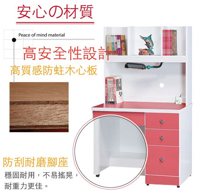 商品 介紹 | 【綠家居】朱莉蒂 現代3.1尺四抽高書桌/電腦桌組合(三色可選) 三色可選+現代簡約風格+安心材質製造,整體採用防蛀木心板+五金滑軌結構+防潮耐磨腳座等安心材質製造,外層採用優利坦全包式亮面噴漆處理搭配採用開放式收納層格+四抽屜+護眼檯燈設置等便利設計,全由專人配送到家,專業安心服務,替你省下更多時間! 【商品特色】 三色可選+現代簡約風格+安心材質製造,使用放心+搭配居家更便利 採用防蛀木心板+五金滑軌結構+防潮耐磨腳座等安心材質製造 採用開放式收納層格+四抽屜+護眼檯燈設置等便利設計 此商品不需要DIY組立,此商品為組立後之成品 品質保證、專業設計、貼心服務 全由專人配送到家,專業安心服務,替您省下更多時間 |