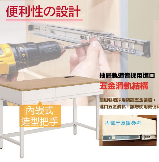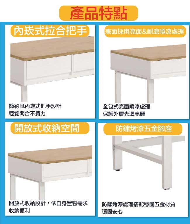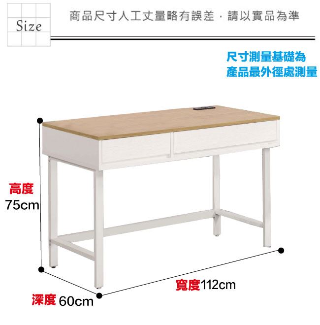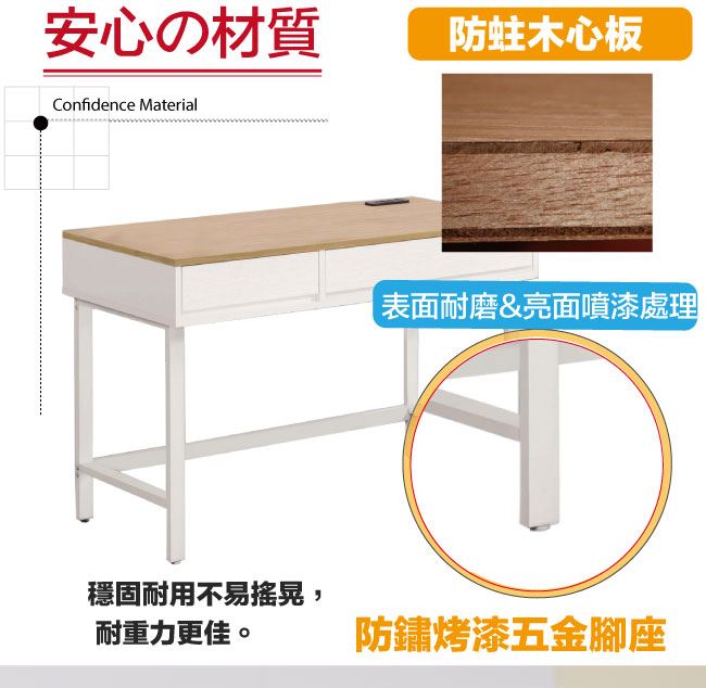 材質 | ◆產品名稱:【綠家居】奈吉亞雙色3.7尺二抽書桌 尺寸:(寬)112x(深)60(高)75/公分 ◆材質: 材質:防蛀木心板+防鏽烤漆五金腳座+五金滑軌結構 噴漆:防潮耐磨&亮面噴漆處理