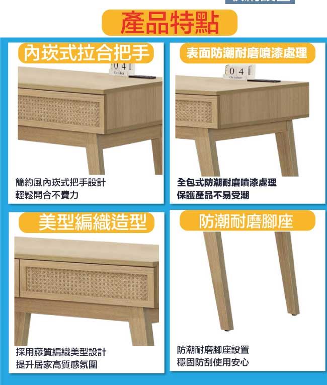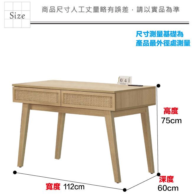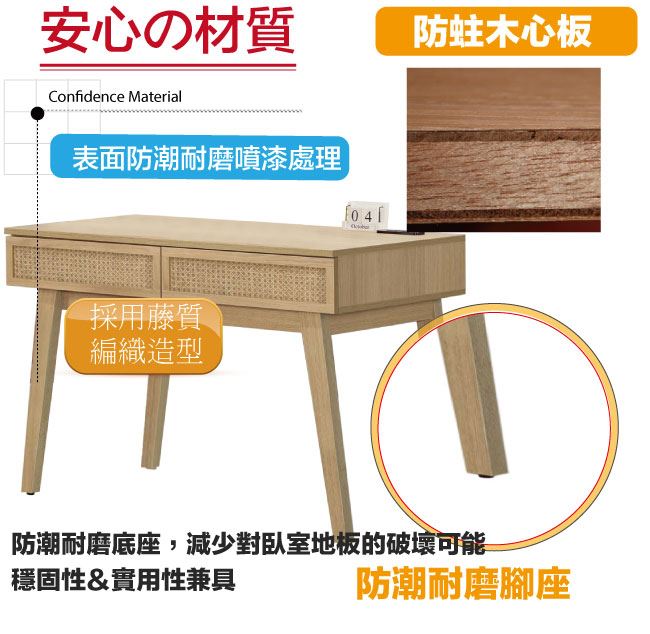 材質 | ◆產品名稱:【綠家居】神奈川編織紋3.7尺二抽書桌 尺寸:(寬)112x(深)60(高)75/公分 ◆材質: 材質:防蛀木心板+防潮耐磨腳座+五金滑軌結構+藤質編織網格 噴漆:防潮耐磨噴漆處理
