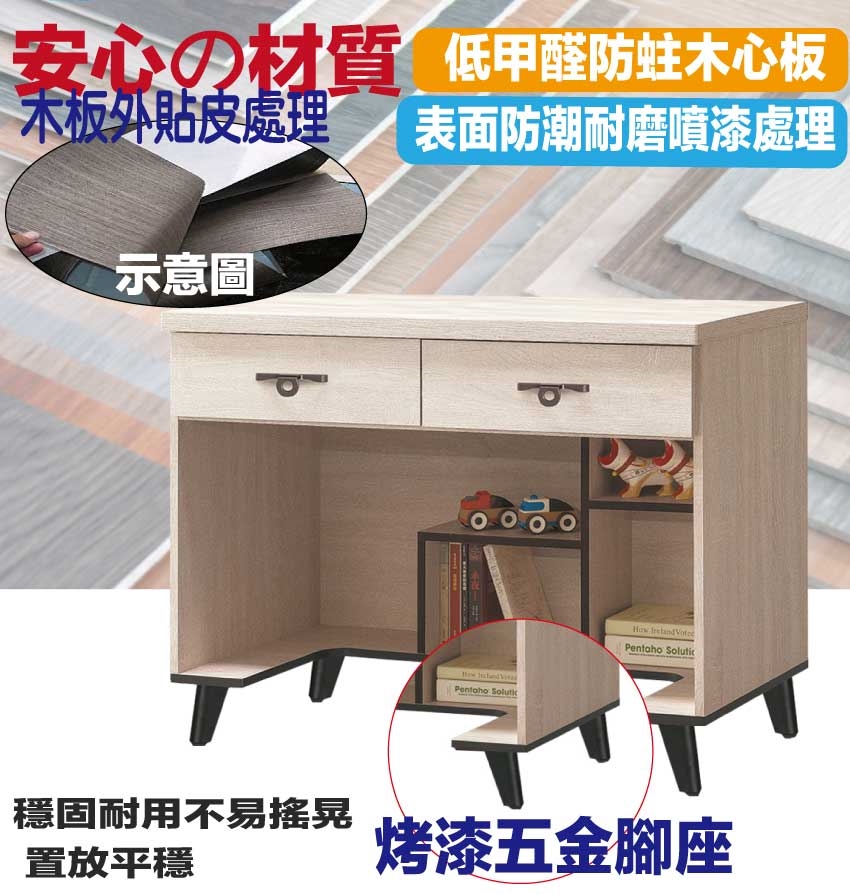 ★偏遠地區需額外加收運費,下標請先問與答詢問★ ★下訂前注意 由於商品流動較快,下訂前請先詢問是否有貨在下訂喔~★ 【綠家居】米砂3.5尺二抽書桌 淺橡木紋色系+安心材質製造,使用放心+搭配居家更便利,採用防蛀木心板+烤漆五金腳座+五金滑軌結構等安心材質製造 ,外層採用防潮耐磨噴漆處理搭配採用二抽屜+開放層格等收納空間設計,全由專人配送到家,專業安心服務,替你省下更多時間!