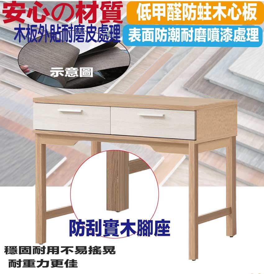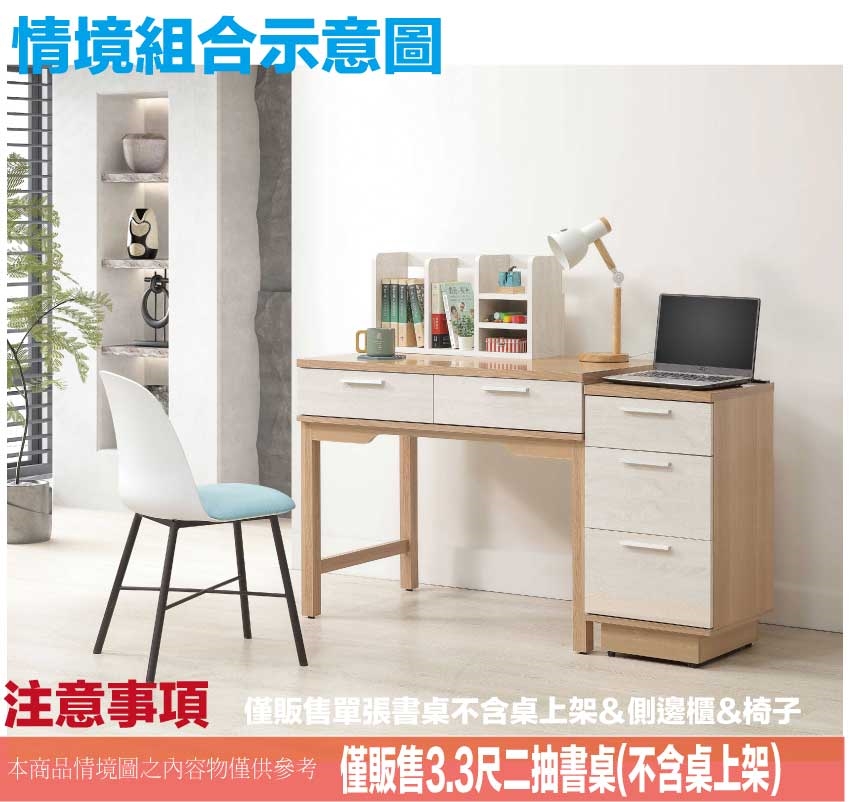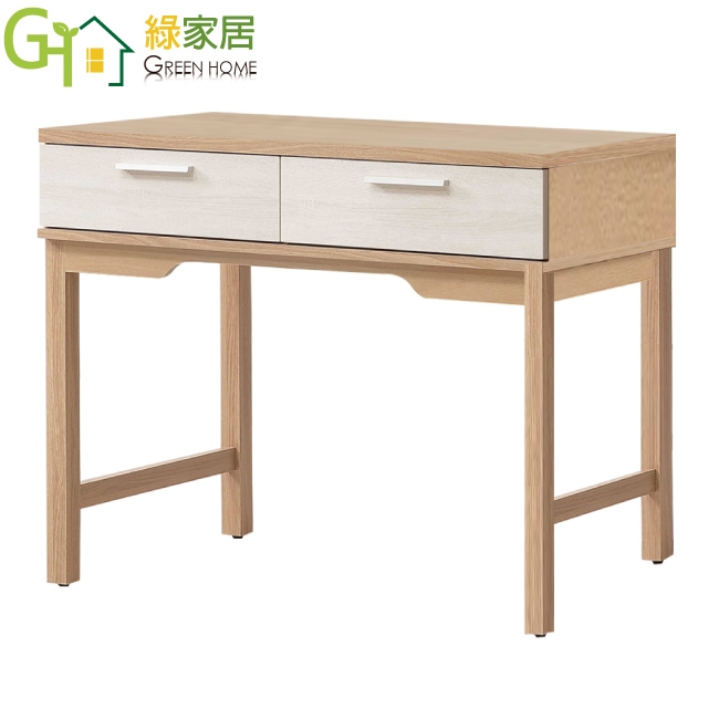 ★偏遠地區需額外加收運費,下標請先問與答詢問★ ★下訂前注意 由於商品流動較快,下訂前請先詢問是否有貨在下訂喔~★ 【綠家居】賓利3.3尺雙色二抽書桌 木紋雙色系+安心材質製造,使用放心+搭配居家更便利,採用防蛀木心板+防刮實木腳座等安心材質製造 ,外層採用防潮耐磨噴漆處理搭配採用二抽屜+開放式桌面等收納空間設計,全由專人配送到家,專業安心服務,替你省下更多時間!