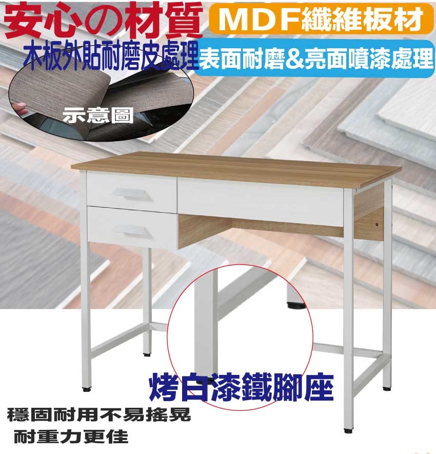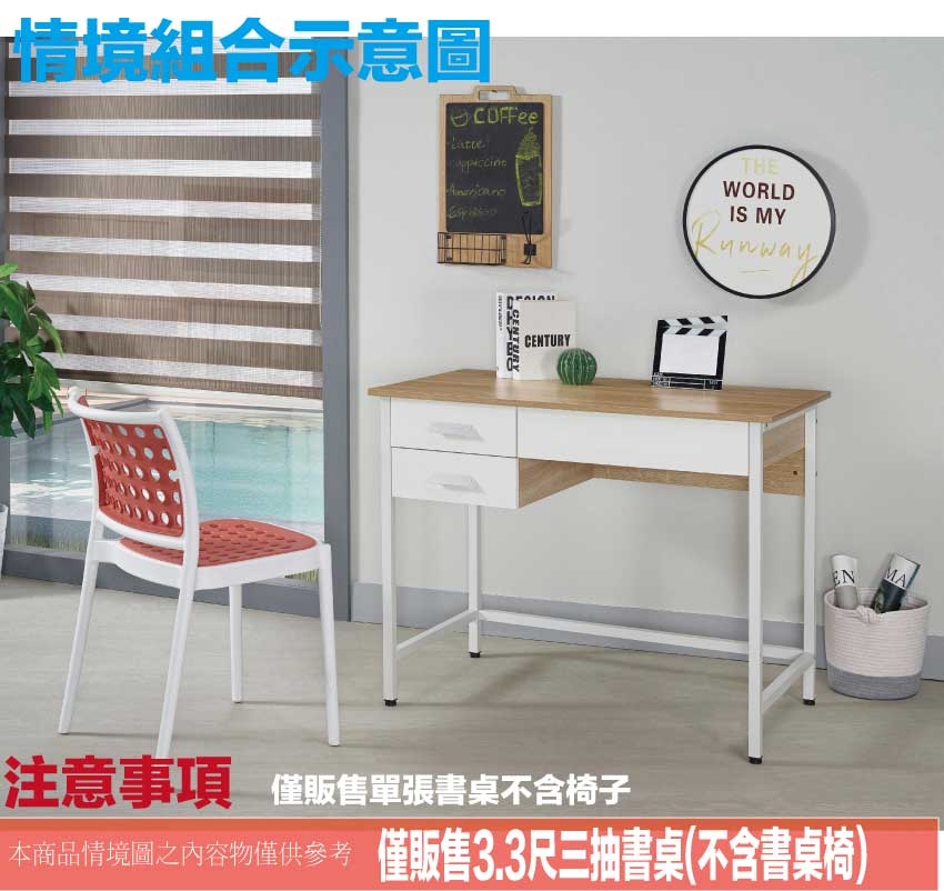 ★偏遠地區需額外加收運費,下標請先問與答詢問★ ★下訂前注意 由於商品流動較快,下訂前請先詢問是否有貨在下訂喔~★ 【綠家居】蘿克3.3尺三抽鐵腳書桌 現代雙色系+安心材質製造,使用放心+搭配居家更便利,採用防潮MDF板+烤漆五金腳座等安心材質製造 ,外層採用防潮耐磨噴漆處理搭配採用三抽屜+開放層格等收納空間設計,全由專人配送到家,專業安心服務,替你省下更多時間!