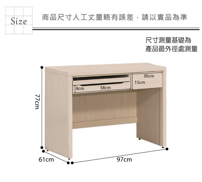 產品名稱:【綠家居】班斯坦 時尚3.2尺木紋書桌/電腦桌(二色可選) 產品尺寸: 書桌:(寬)97x (深)61x(高)77/ 公分 產品材質: 材質:防蛀木心板 軌道:鋼珠滑軌結構 塗裝:優利坦抗磨三層全包式塗漆塗裝商品編號 | 尺寸 | 顏色 | 組裝方式 |
