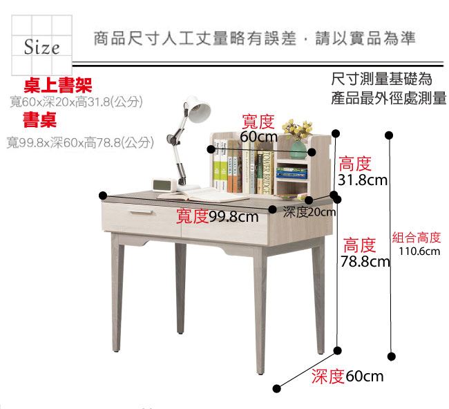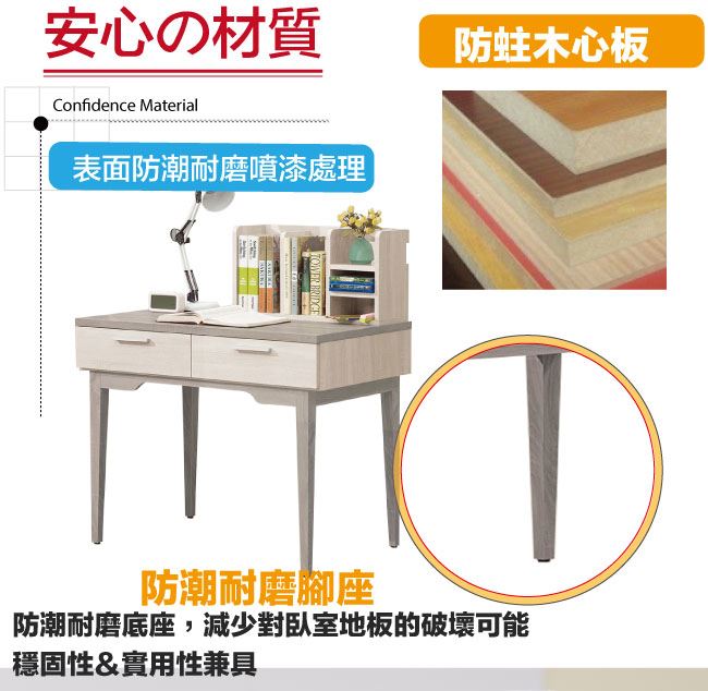 材質 | ◆產品名稱:【綠家居】芙娜雙色3.3尺二抽書桌組合(書桌+桌上收納櫃) 書桌尺寸:(寬)99.8(深)60(高)78.8公分 桌上收納櫃尺寸:(寬)60(深)20(高)31.8公分 組合尺寸:(寬)99.8(深)60(高)110.6公分 ◆材質: 材質:防蛀木心板+防潮耐磨腳座+五金滑軌結構 噴漆:防潮耐磨噴漆處理