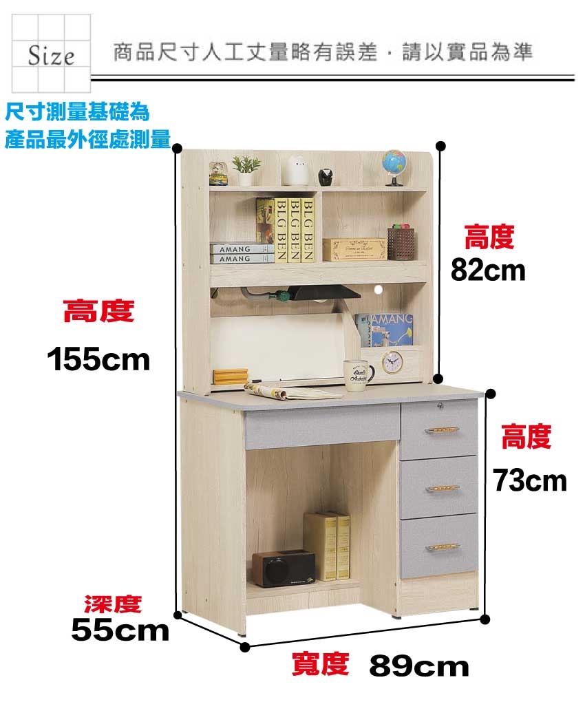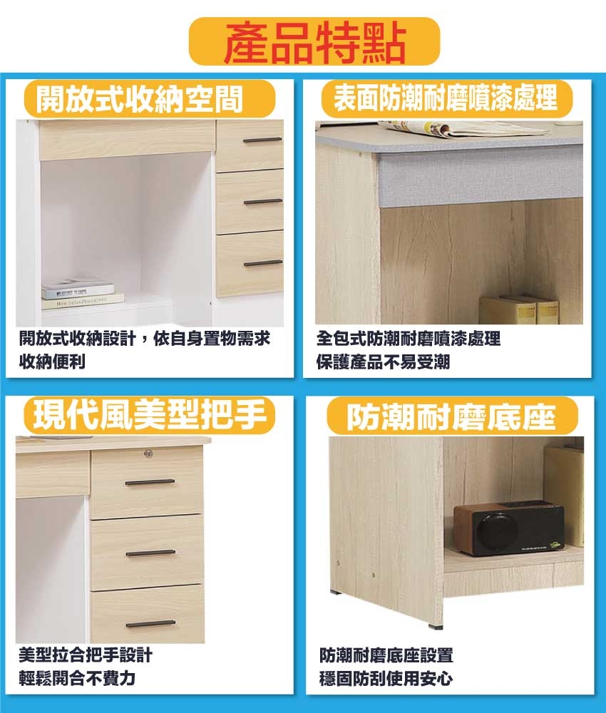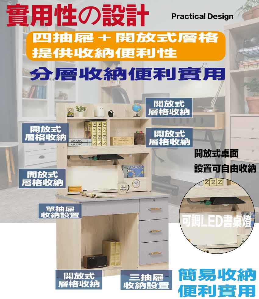 搭配採用四抽屜+開放多層格+可調書桌燈等收納空間設計