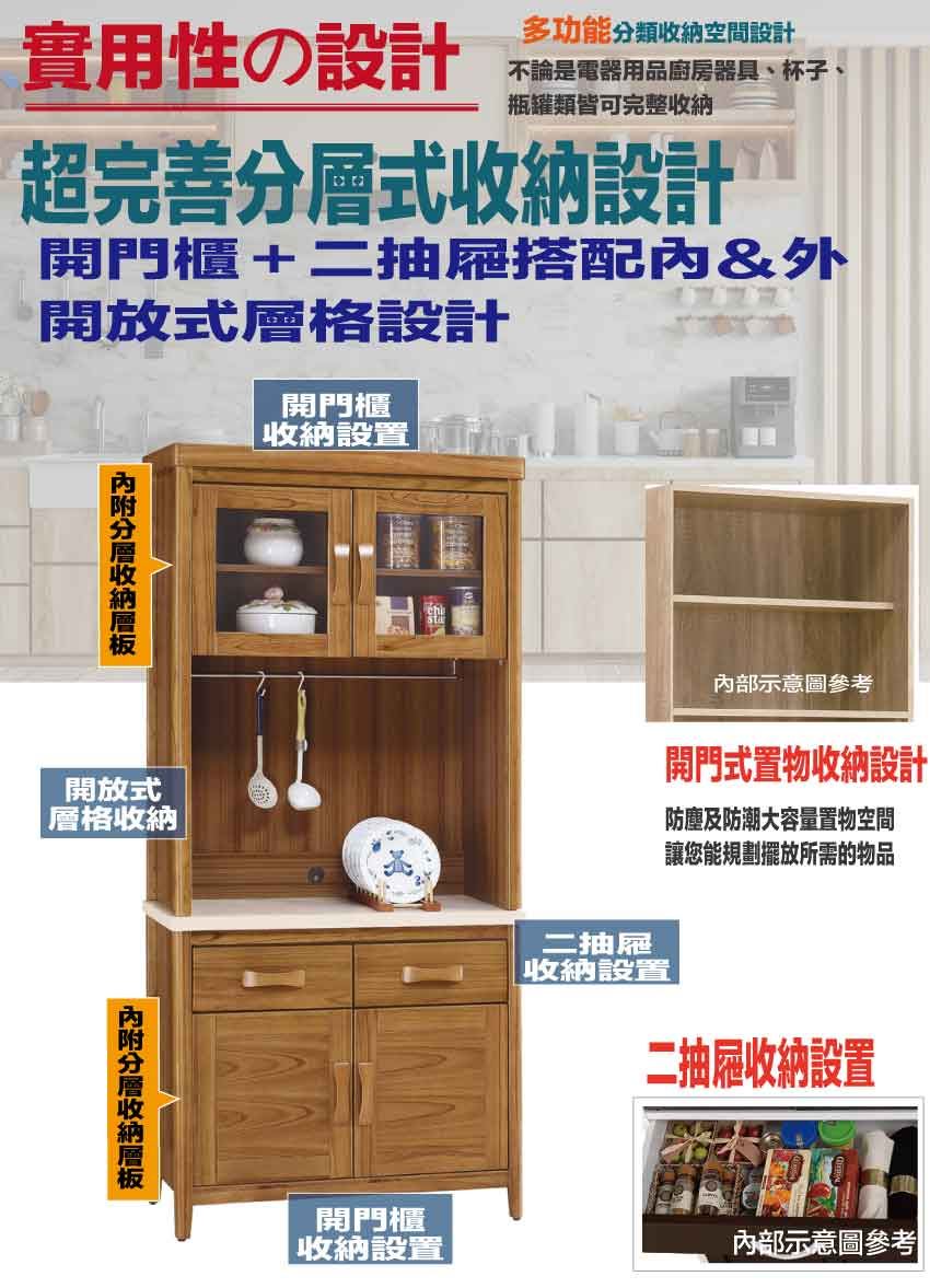 採用開門櫃+二抽屜+內&外開放層格等收納空間設計