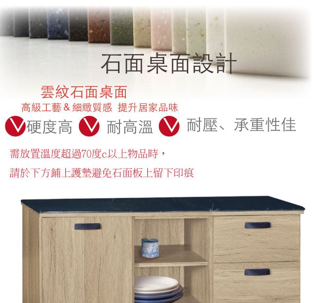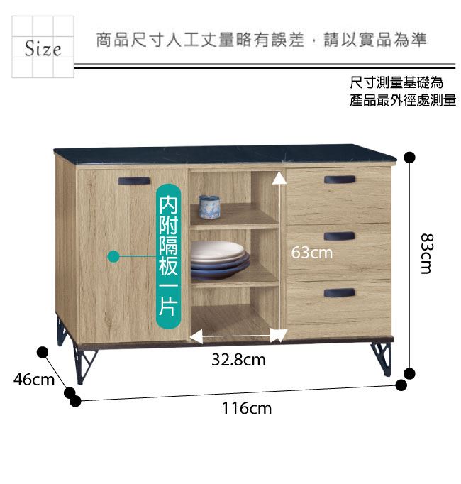 材質 | ◆產品名稱: 【綠家居】哈爾 橡木紋3.9尺三抽雲紋石面餐櫃 尺寸:(寬)116x(深)46x(高)83/公分 ◆材質: 材質:防蛀木心板+黑鐵砂腳座+五金滑軌結構+12mm雲紋石面板+防夾手緩衝門片五金 噴漆:防潮耐磨噴漆處理