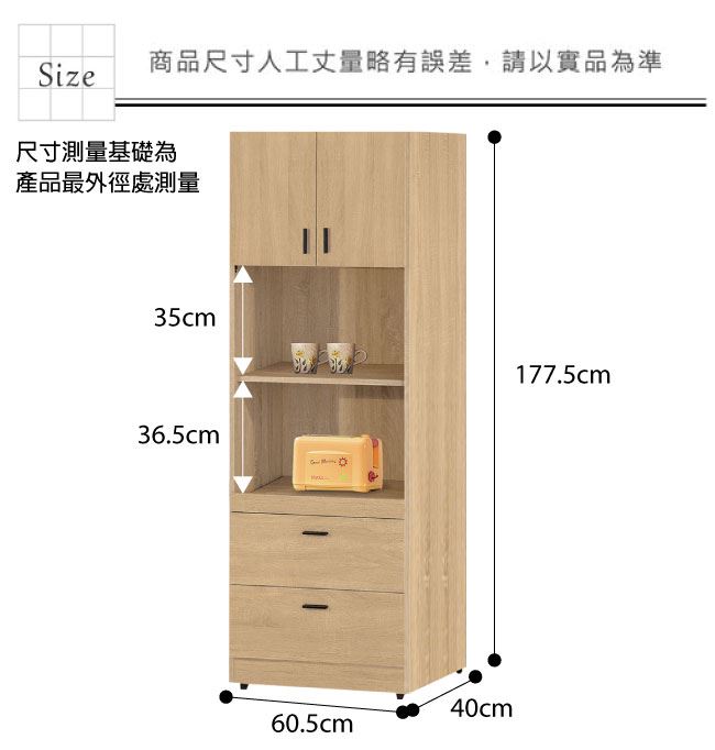 材質 | ◆產品名稱: 【綠家居】巴哈爾 橡木紋2尺拉盤二門二抽高餐櫃 尺寸:(寬)60(深)40x(高)177.5/公分 ◆材質: 材質:防蛀木心板+防潮耐磨腳座+五金滑軌結構+防夾手緩衝門片五金 噴漆:防潮耐磨噴漆處理