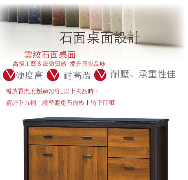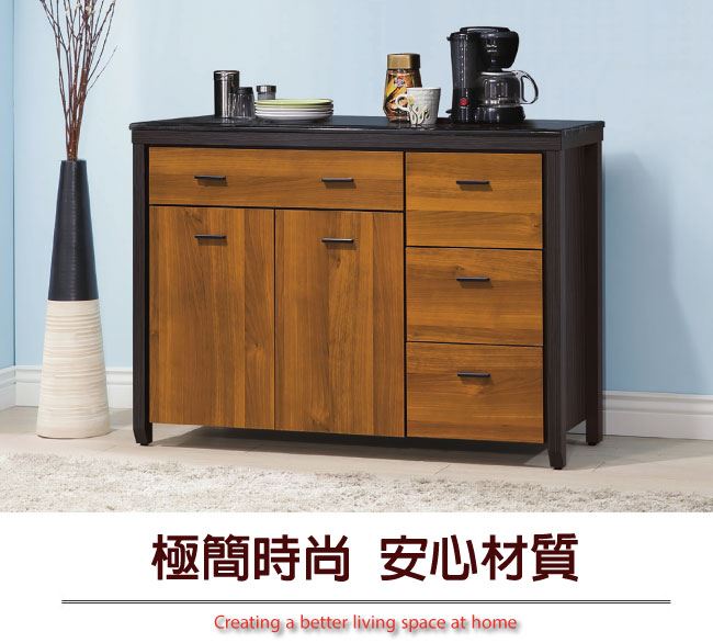 商品介紹 | 【綠家居】海森 雙色3.9尺雲紋石面餐櫃 木紋雙色系+現代簡約風格+安心材質製造,整體採用防蛀木心板+防潮黑漆腳座+五金滑軌結構+12mm雲紋石面板+防夾手緩衝門片五金等安心材質製造,產品外層採用防潮耐磨噴漆處理搭配採用開門櫃+四抽屜+開放式收納等收納空間設計,全由專人配送到家,專業安心服務,替你省下更多時間! 【商品特色】 木紋雙色系+現代簡約風格+安心材質製造,使用放心+搭配居家更便利 採用防蛀木心板+防潮黑漆腳座+五金滑軌結構+12mm雲紋石面板+防夾手緩衝門片五金等安心材質製造 產品外層採用防潮耐磨噴漆處理 搭配採用開門櫃+四抽屜+開放式收納等收納空間設計 此商品不需要DIY組立,此商品為組立後之成品 品質保證、專業設計、貼心服務 全由專人配送到家,專業安心服務,替您省下更多時間 |