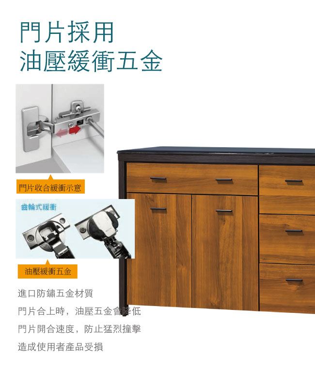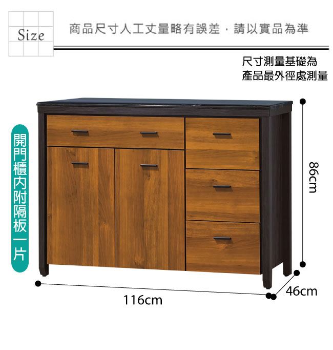 材質 | ◆產品名稱: 【綠家居】海森 雙色3.9尺雲紋石面餐櫃 尺寸:(寬)116(深)46x(高)86/公分 ◆材質: 材質:防蛀木心板+防潮黑漆腳座+五金滑軌結構+12mm雲紋石面板+防夾手緩衝門片五金 噴漆:防潮耐磨噴漆處理