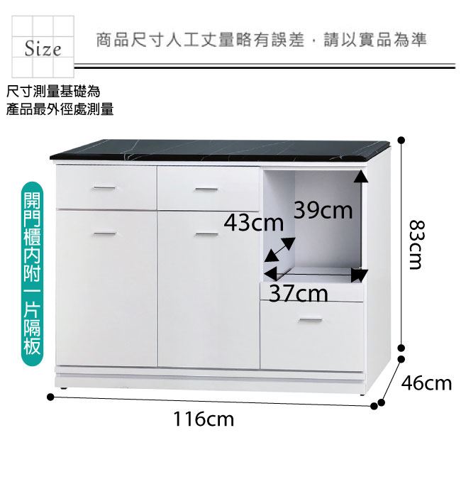 材質 | ◆產品名稱: 【綠家居】布爾依 時尚3.9尺拉盤雲紋石面餐櫃(三色可選) 尺寸:(寬)116(深)46x(高)83/公分 ◆材質: 材質:防蛀木心板+防潮耐磨腳座+五金滑軌結構+12mm雲紋石面板&黑岩板石面+防夾手緩衝門片五金 噴漆:防潮耐磨&亮面噴漆處理