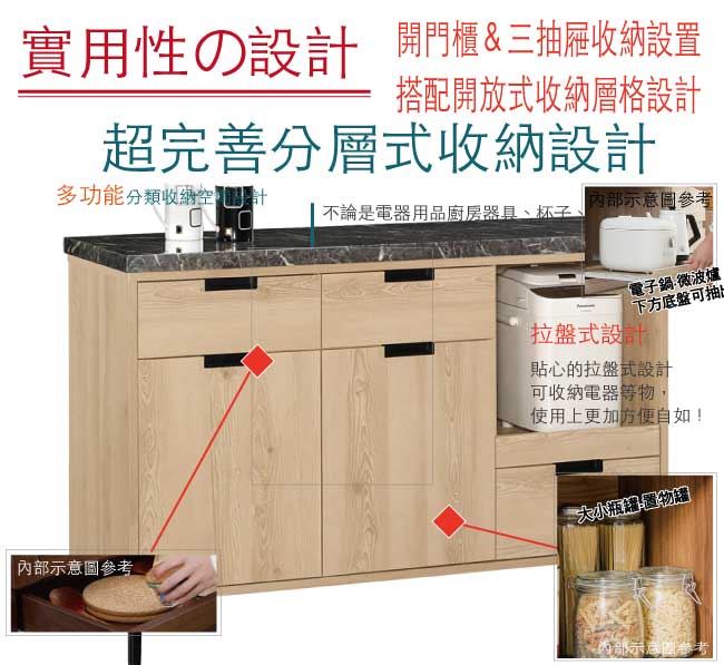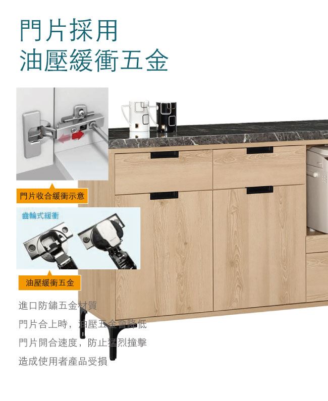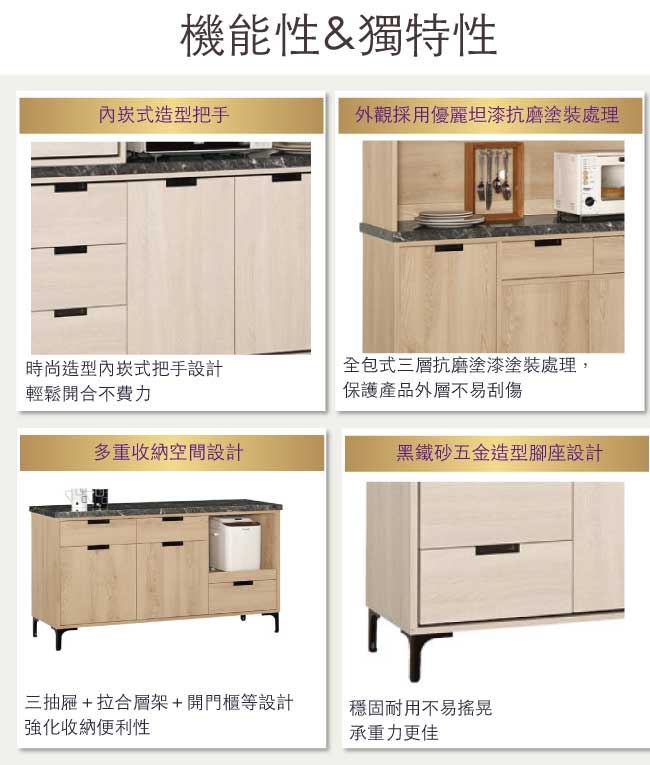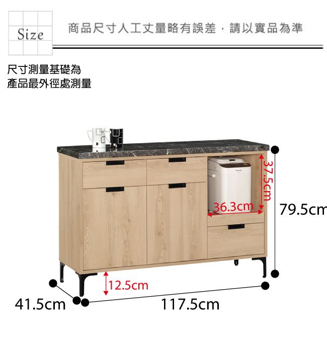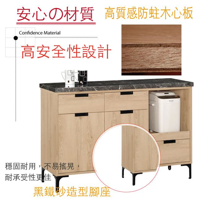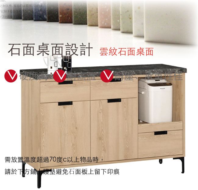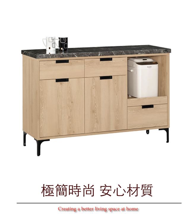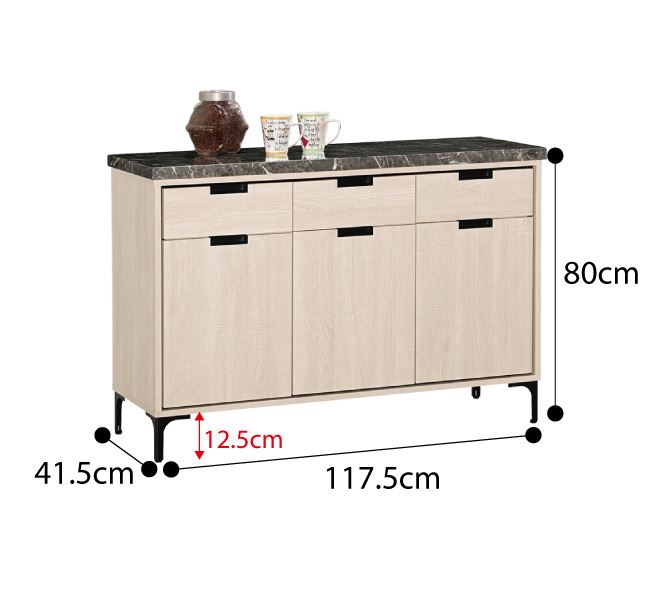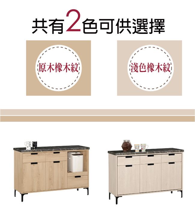 材質 | ◆產品名稱: 【綠家居】艾尼達 時尚3.9尺雲紋石面餐櫃(二色可選) 原橡木紋尺寸:(寬)117.5x(深)41.5x(高)79.5/公分 淺橡木紋尺寸:(寬)117.5x(深)41.5x(高)80/公分 ◆材質: 材質:防蛀木心板+ 黑鐵砂腳座+五金滑軌結構+2cm雲紋石面板+防夾手緩衝門片五金 噴漆:防潮耐磨噴漆處理