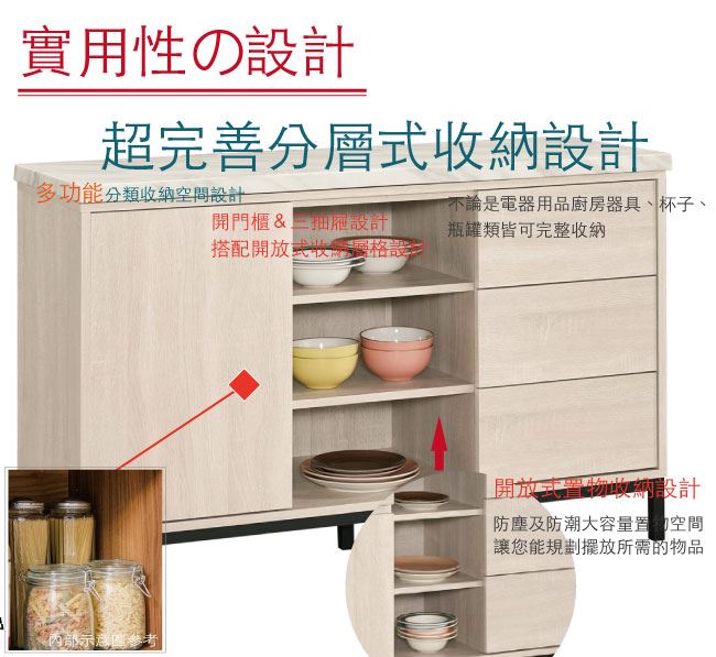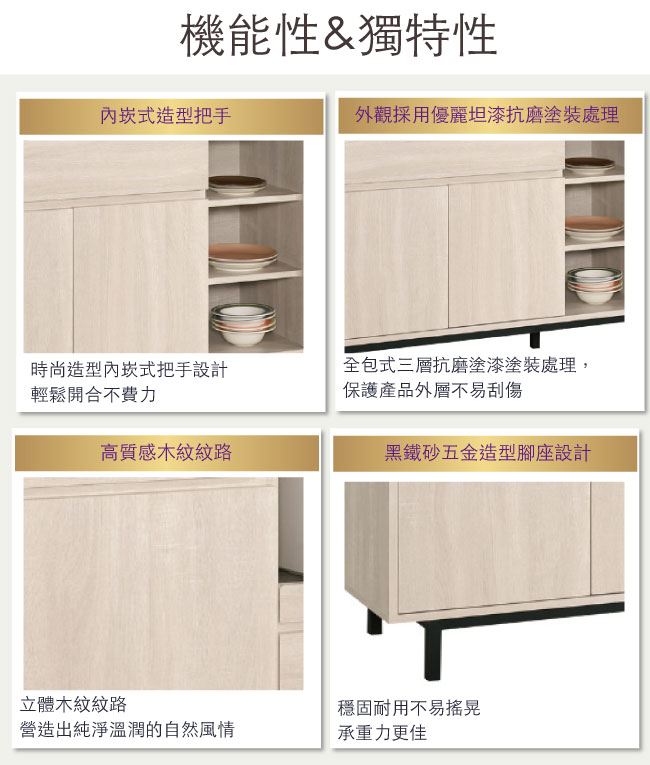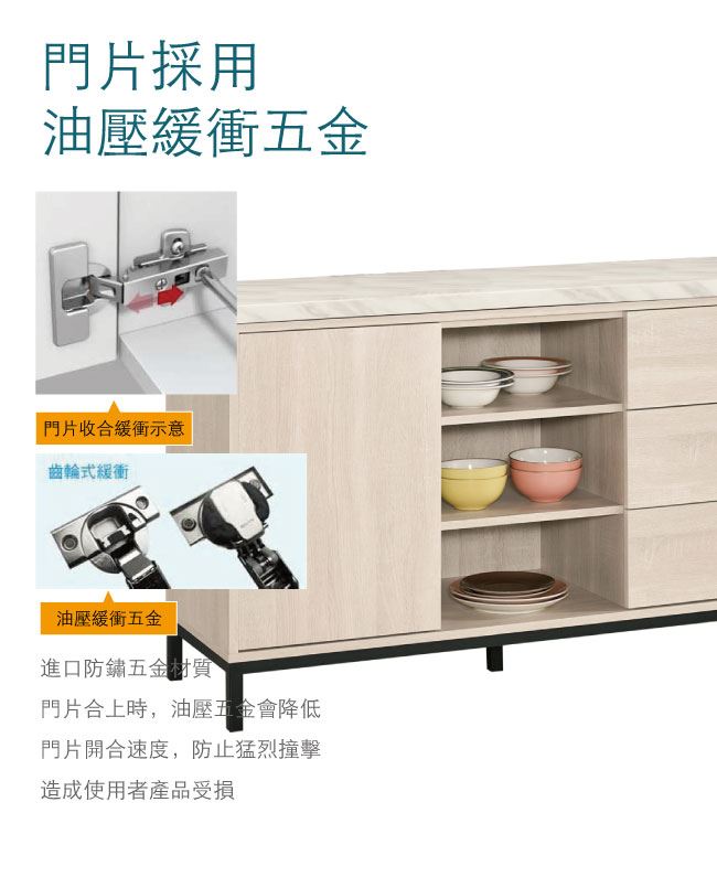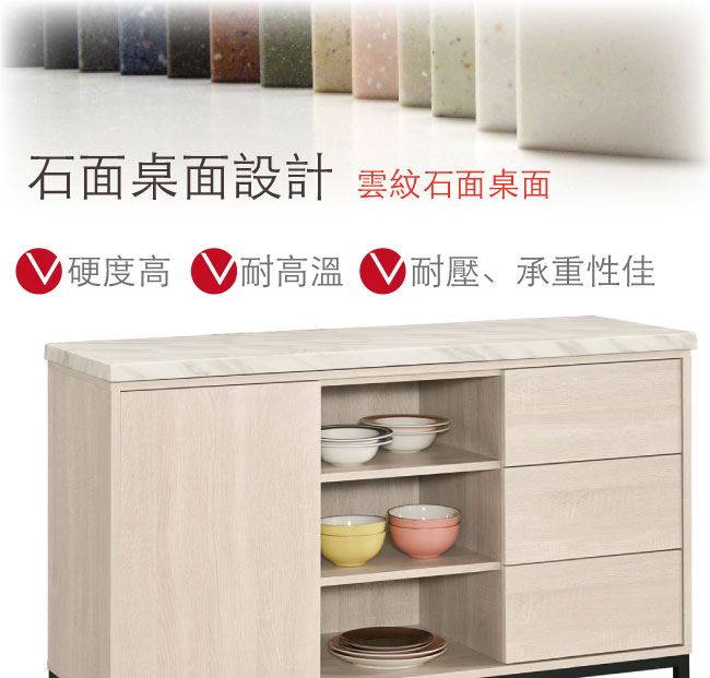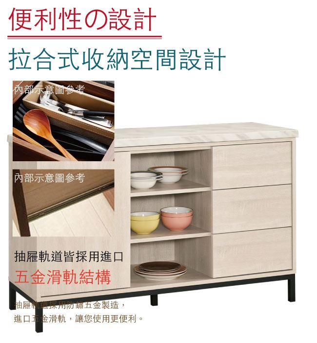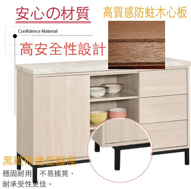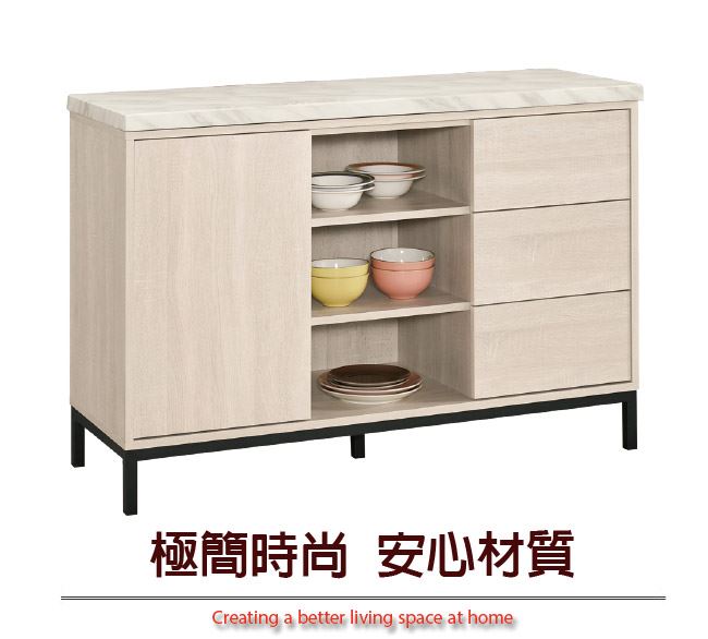 商品介紹 | 【綠家居】曼克特 時尚3.9尺雲紋石面餐櫃 淺橡木紋色系+現代簡約風格+安心材質製造,整體採用防蛀木心板+黑鐵砂框架&腳座+五金滑軌結構+2cm雲紋石面板+防夾手緩衝門片五金等安心材質製造,產品外層採用防潮耐磨噴漆處理搭配三抽屜+開門櫃+開放式收納層格等收納空間設計,全由專人配送到家,專業安心服務,替你省下更多時間! 【商品特色】 淺橡木紋色系+現代簡約風格+安心材質製造,使用放心+搭配居家更便利 採用防蛀木心板+黑鐵砂框架&腳座+五金滑軌結構+2cm雲紋石面板+防夾手緩衝門片五金等安心材質製造 產品外層採用防潮耐磨噴漆處理 搭配採用三抽屜+開門櫃+開放式收納層格等收納空間設計 此商品不需要DIY組立,此商品為組立後之成品 品質保證、專業設計、貼心服務 全由專人配送到家,專業安心服務,替您省下更多時間 |