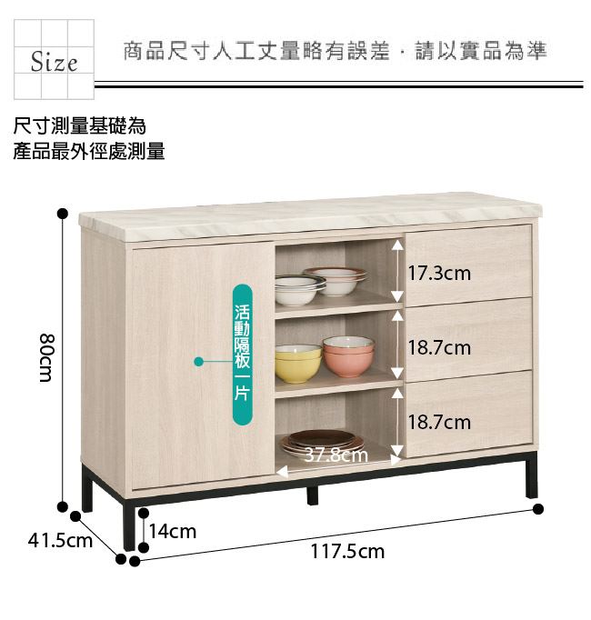 材質 | ◆產品名稱: 【綠家居】曼克特 時尚3.9尺雲紋石面餐櫃 尺寸:(寬)117.5x(深)41.5x(高)80/公分 ◆材質: 材質:防蛀木心板+黑鐵砂框架&腳座+五金滑軌結構+2cm雲紋石面板+防夾手緩衝門片五金 噴漆:防潮耐磨噴漆處理