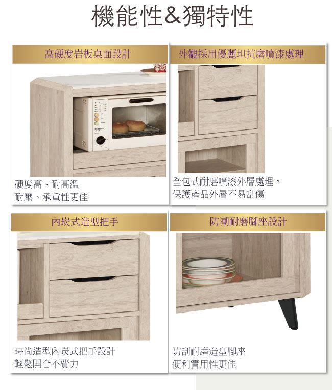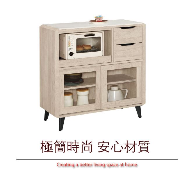 商品介紹 | 【綠家居】卡蘭 岩板3尺推門二抽餐櫃/收納櫃 橡木紋色系+現代簡約風格+安心材質製造,整體採用防蛀木心板+五金滑軌結構+黑鐵砂腳座+12mm岩板桌面板等安心材質製造,外層採用優利坦全包式耐磨噴漆處理搭配推門櫃+二抽屜+拉合式層架+內&外開放式收納等收納設計,全由專人配送到家,專業安心服務,替你省下更多時間! 【商品特色】 橡木紋色系+現代簡約風格+安心材質製造,使用放心+搭配居家更便利 採用防蛀木心板+五金滑軌結構+黑鐵砂腳座+12mm岩板桌面板等安心材質製造 推門櫃+二抽屜+拉合式層架+內&外開放式收納等收納設計 此商品不需要DIY組立,此商品為組立後之成品 品質保證、專業設計、貼心服務 全由專人配送到家,專業安心服務,替您省下更多時間 |