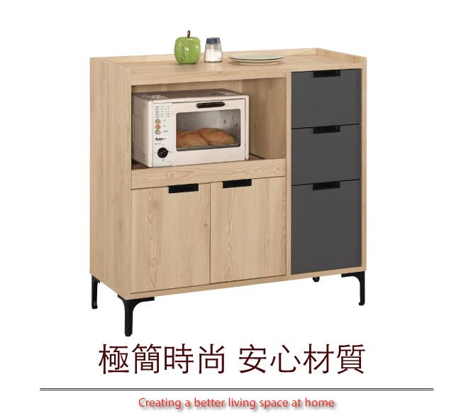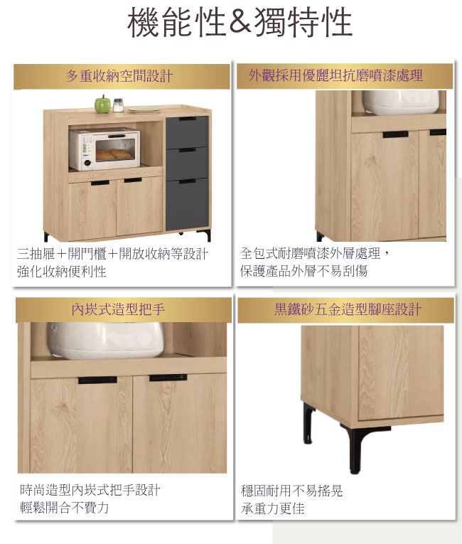 商品介紹 | 【綠家居】卡泰 雙色3尺二門三抽餐櫃 橡木紋雙色系+現代簡約風格+安心材質製造,整體採用防蛀木心板+五金滑軌結構+黑鐵砂腳座+防夾手緩衝門片五金等安心材質製造,外層採用優利坦全包式耐磨噴漆處理搭配開門櫃+三抽屜+拉合式層架+內&外開放式層格等收納設計,全由專人配送到家,專業安心服務,替你省下更多時間! 【商品特色】 橡木紋雙色系+現代簡約風格+安心材質製造,使用放心+搭配居家更便利 採用防蛀木心板+五金滑軌結構+黑鐵砂腳座+防夾手緩衝門片五金等安心材質製造 開門櫃+三抽屜+拉合式層架+內&外開放式層格等收納設計 此商品不需要DIY組立,此商品為組立後之成品 品質保證、專業設計、貼心服務 全由專人配送到家,專業安心服務,替您省下更多時間 |