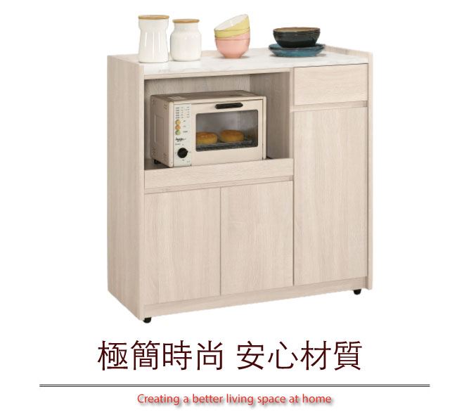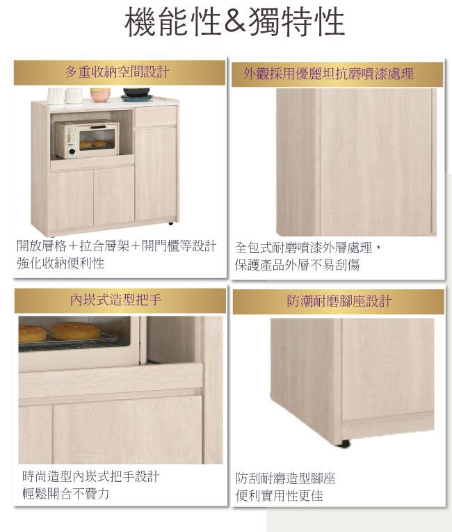 商品介紹 | 【綠家居】馬加柏 淺橡3尺三門單抽餐櫃/收納櫃 淺橡木紋色系+現代簡約風格+安心材質製造,整體採用防蛀木心板+五金滑軌結構+防潮耐磨腳座+仿石面紋路木質桌面板+防夾手緩衝門片五金等安心材質製造,外層採用優利坦全包式耐磨噴漆處理搭配開門櫃+單抽屜+拉合式層架+內&外開放式收納等收納設計,全由專人配送到家,專業安心服務,替你省下更多時間! 【商品特色】 淺橡木紋色系+現代簡約風格+安心材質製造,使用放心+搭配居家更便利 採用防蛀木心板+五金滑軌結構+防潮耐磨腳座+仿石面紋路木質桌面板+防夾手緩衝門片五金等安心材質製造 開門櫃+單抽屜+拉合式層架+內&外開放式收納等收納設計 此商品不需要DIY組立,此商品為組立後之成品 品質保證、專業設計、貼心服務 全由專人配送到家,專業安心服務,替您省下更多時間 |