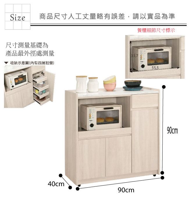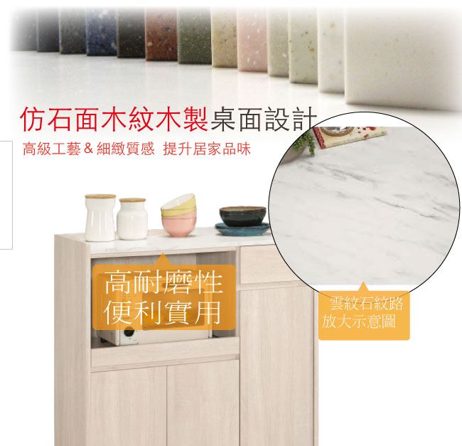 材質 | ◆產品名稱: 【綠家居】馬加柏 淺橡3尺三門單抽餐櫃/收納櫃 產品尺寸: 尺寸:(寬)90x(深)40x(高)90公分 ◆材質: 材質:防蛀木心板+防潮耐磨腳座+仿石面紋路木質桌面板 材質:五金滑軌結構+防夾手緩衝門片五金 塗漆:優利坦全包式耐磨噴漆處理