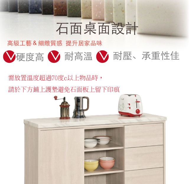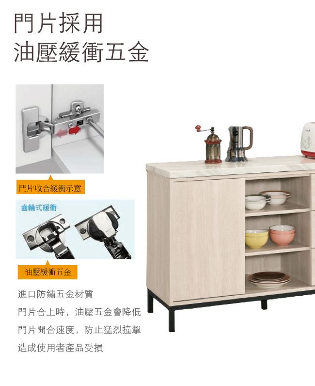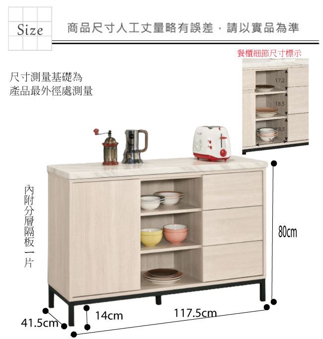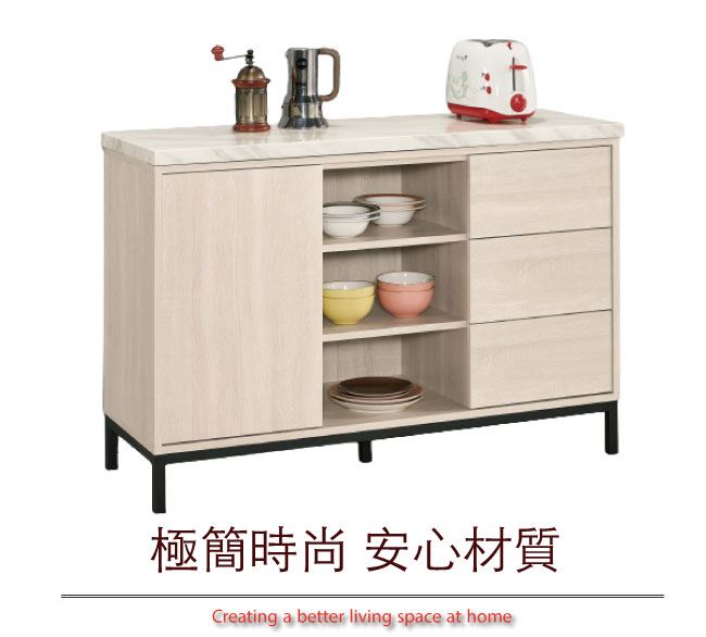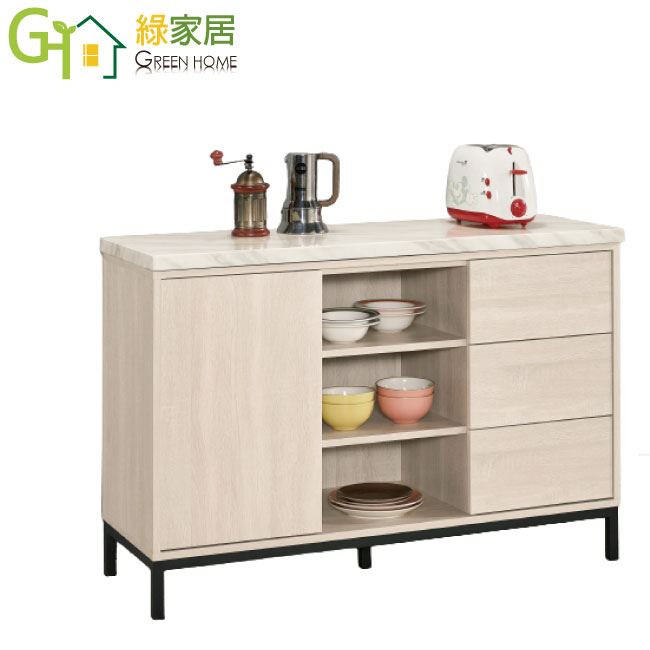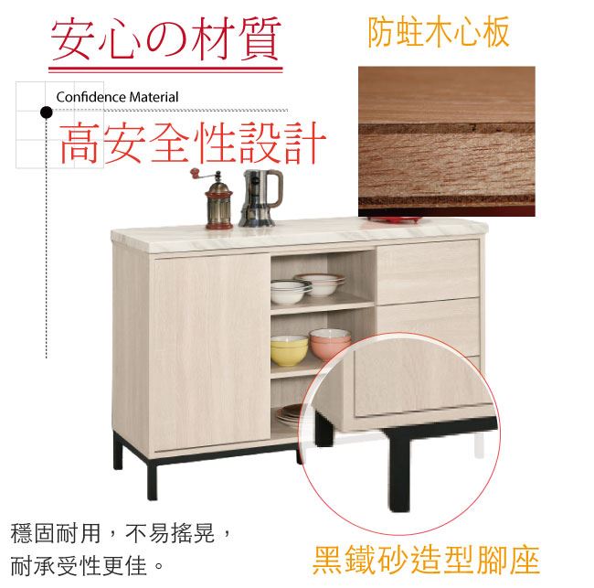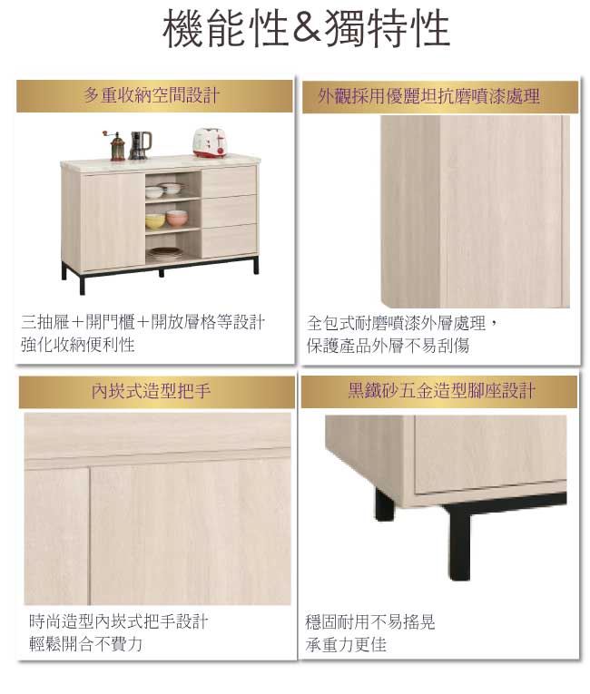 材質 | ◆產品名稱: 【綠家居】馬加柏 淺橡3.9尺單門三抽餐櫃/收納櫃 產品尺寸: 尺寸:(寬)117.5x(深)41.5x(高)80公分 ◆材質: 材質:防蛀木心板+黑鐵砂腳座+仿石面紋路木質桌面板 材質:五金滑軌結構+防夾手緩衝門片五金 塗漆:優利坦全包式耐磨噴漆處理