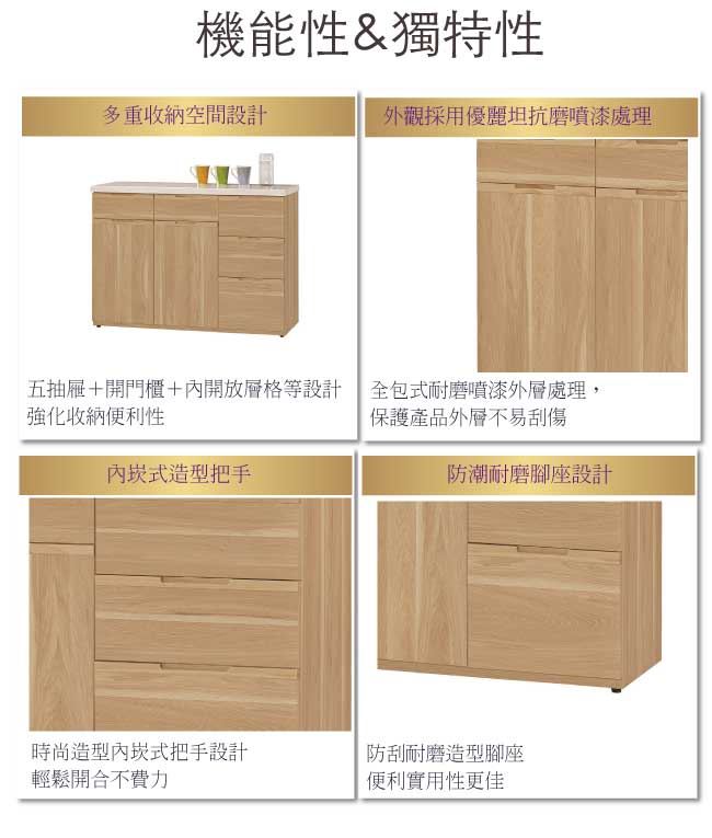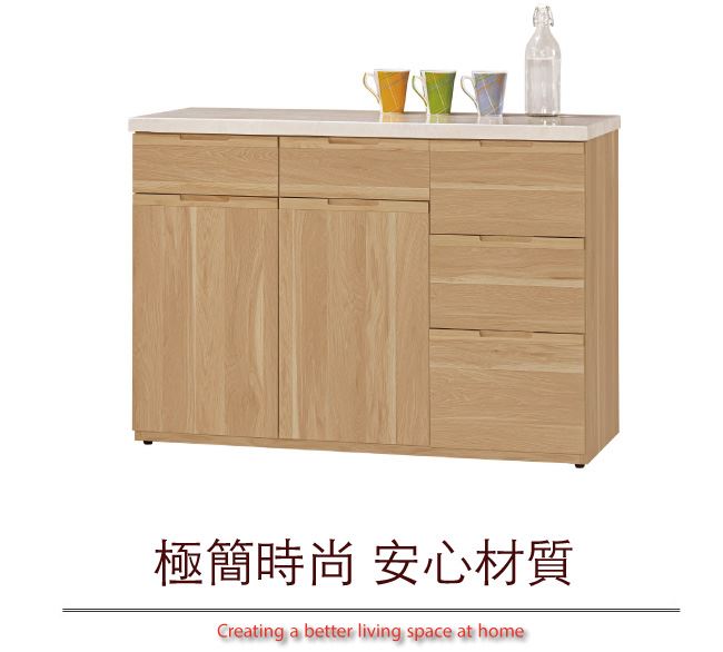 商品介紹 | 【綠家居】魯班特 時尚3.9尺雲紋石面餐櫃 橡木紋色系+現代簡約風格+安心材質製造,整體採用防蛀木心板+防潮耐磨腳座+五金滑軌結構+2cm雲紋石面板等安心材質製造,產品外層採用防潮耐磨噴漆處理搭配五抽屜(含刀叉專用收納抽屜)+開門櫃+內開放式層格等收納空間設計,全由專人配送到家,專業安心服務,替你省下更多時間! 【商品特色】 橡木紋色系+現代簡約風格+安心材質製造,使用放心+搭配居家更便利 採用防蛀木心板+防潮耐磨腳座+五金滑軌結構+2cm雲紋石面板等安心材質製造 產品外層採用防潮耐磨噴漆處理 搭配採用五抽屜(含刀叉專用收納抽屜)+開門櫃+內開放式層格等收納空間設計 此商品不需要DIY組立,此商品為組立後之成品 品質保證、專業設計、貼心服務 全由專人配送到家,專業安心服務,替您省下更多時間 |