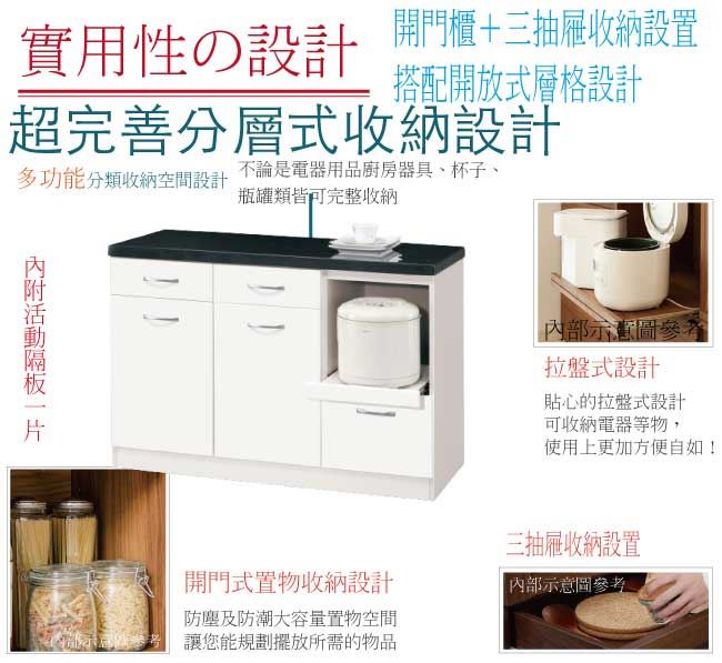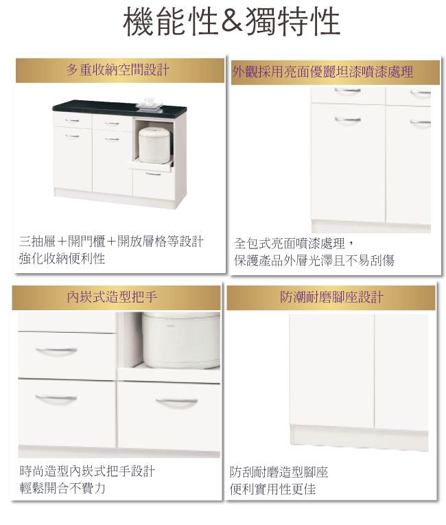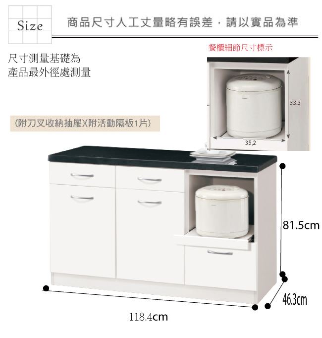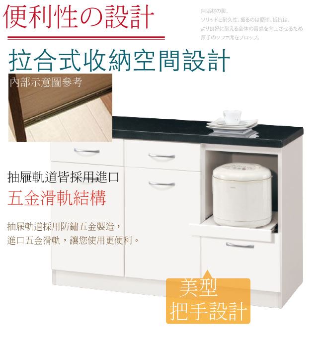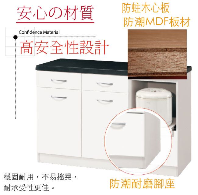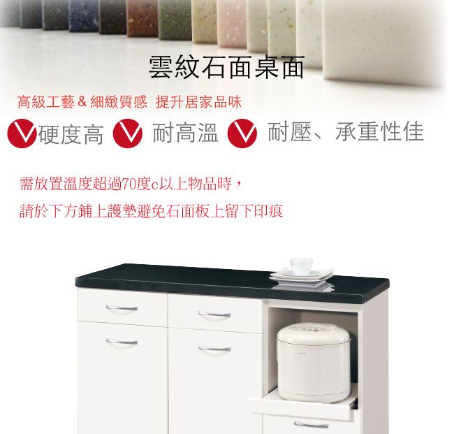 材質 | ◆產品名稱: 【綠家居】瑪特伊 時尚白3.9尺雲紋石面餐櫃 尺寸:(寬)118.4x(深)46.3x(高)81.5/公分 ◆材質: 材質:防蛀木心板+防潮MD板材+防潮耐磨腳座+五金滑軌結構+2cm雲紋石面板 噴漆:防潮亮面噴漆處理