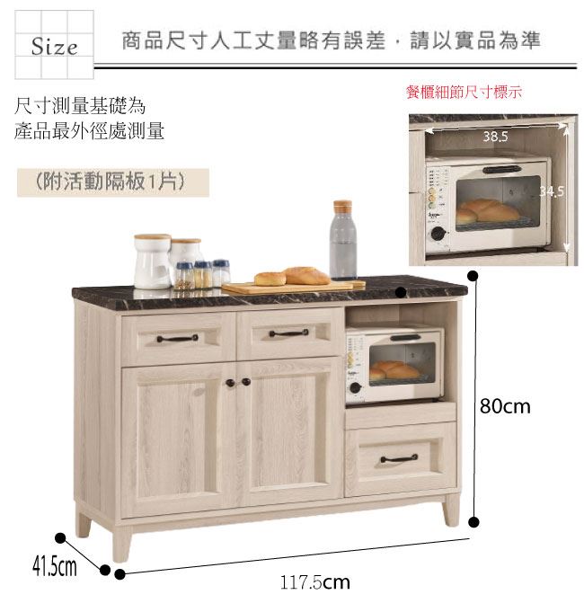 材質 | ◆產品名稱: 【綠家居】馬拉提 淺橡3.9尺雲紋石面餐櫃/收納櫃 產品尺寸: 尺寸:(寬)117.5x(深)41.5x(高)80公分 ◆材質: 材質:防蛀木心板+防潮耐磨腳座 材質:防夾手緩衝門片五金+五金滑軌結構+2cm雲紋石面桌面板 塗漆:優利坦全包式耐磨噴漆處理