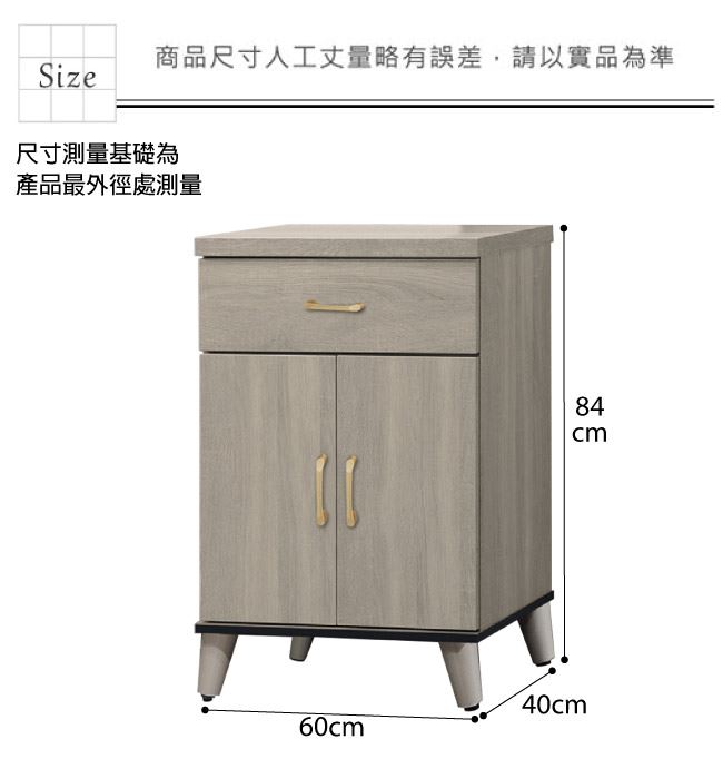 低餐櫃尺寸:(寬)60(深)40(高)84公分 ◆材質: 材質:防蛀木心板+防潮耐磨腳座+防夾手緩衝門片五金+五金滑軌結構 噴漆:防潮耐磨噴漆處理