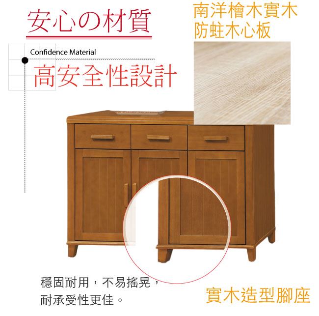 商品 介紹 | 【綠家居】梅利實木3.9尺三門三抽餐櫃 柚木紋色系+現代簡約風格+安心材質製造,整體採用進口南洋檜木實木+防蛀木心板+防刮耐磨腳座+五金滑軌結構等安心材質製造,產品外層採用防潮耐磨噴漆處理搭配採用開門櫃+三抽屜+內開放式收納等收納空間設計,全由專人配送到家,專業安心服務,替你省下更多時間! 【商品特色】 柚木紋色系+現代簡約風格+安心材質製造,使用放心+搭配居家更便利 採用進口南洋檜木實木+防蛀木心板+防刮耐磨腳座+五金滑軌結構等安心材質製造 產品外層採用防潮耐磨噴漆處理 搭配採用開門櫃+三抽屜+內開放式收納等收納空間設計 此商品不需要DIY組立,此商品為組立後之成品 品質保證、專業設計、貼心服務 全由專人配送到家,專業安心服務,替您省下更多時間 |