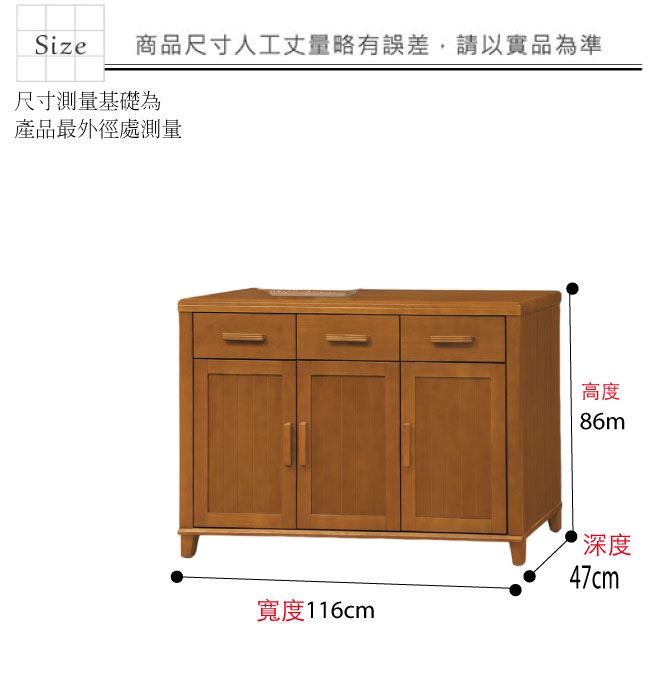 材質 | ◆產品名稱:【綠家居】梅利實木3.9尺三門三抽餐櫃 尺寸:(寬)116x(深)47(高)86/公分 ◆材質: 材質:進口南洋檜木實木+防蛀木心板+防刮耐磨腳座+五金滑軌結構 噴漆:防潮耐磨噴漆處理