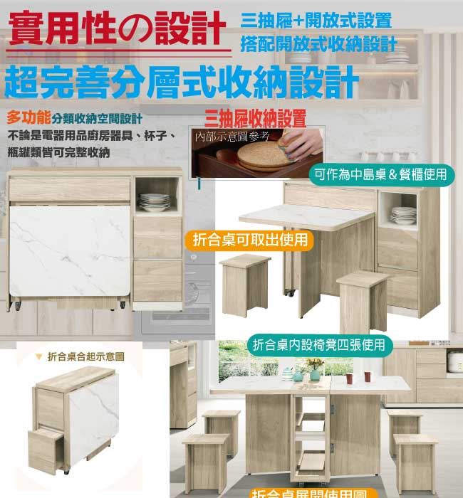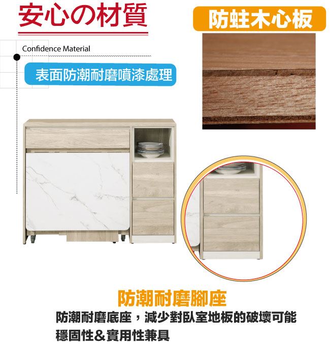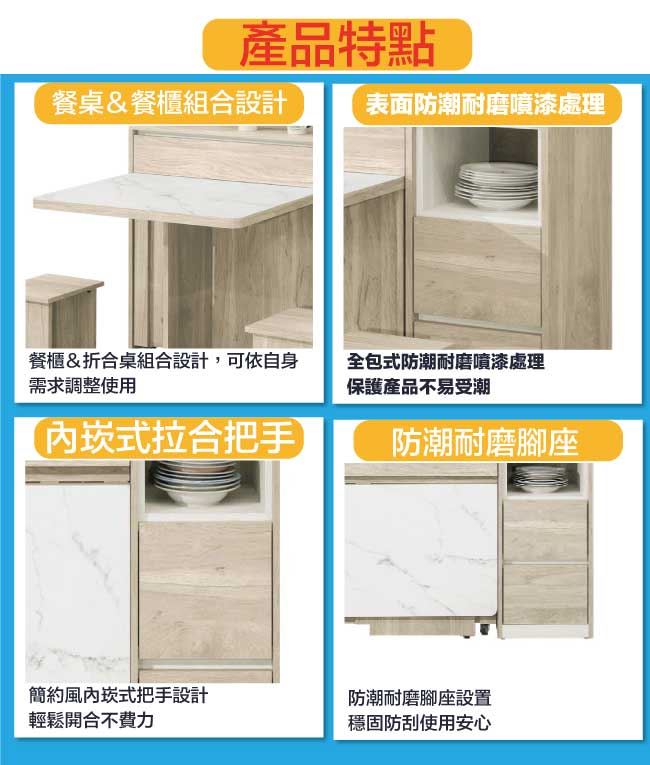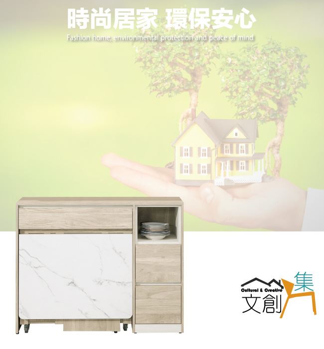 商品 介紹 | 【綠家居】羅娜3.9尺多功能低餐桌櫃組合(拉合餐桌+低餐櫃) 木紋雙色系+現代簡約風格+安心材質製造,整體採用防蛀木心板+防潮耐磨腳座+五金滑軌結構+防夾手緩衝門片五金+仿大理石紋木質桌面板等安心材質製造,產品外層採用防潮耐磨噴漆處理搭配採用三抽屜+內&外開放式層格等收納空間設計,全由專人配送到家,專業安心服務,替你省下更多時間! 【商品特色】 木紋雙色系+現代簡約風格+安心材質製造,使用放心+搭配居家更便利 餐桌+餐櫃組合,櫃內折合式餐桌可拉出使用,展開後即可變成中島桌及5尺長方型餐桌(內含四張椅凳),打造居家高便利機能性空間設計 採用防蛀木心板+防潮耐磨腳座+五金滑軌結構+防夾手緩衝門片五金+仿大理石紋木質桌面板等安心材質製造 產品外層採用防潮耐磨噴漆處理 採用三抽屜+內&外開放式層格等收納空間設計 此商品不需要DIY組立,此商品為組立後之成品 品質保證、專業設計、貼心服務 全由專人配送到家,專業安心服務,替您省下更多時間 |
