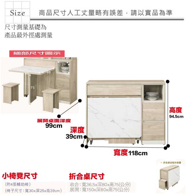 材質 | ◆產品名稱:【綠家居】羅娜3.9尺多功能低餐桌櫃組合(拉合餐桌+低餐櫃) 低餐櫃尺寸:(寬)118x(深)39(高)94.5公分 折合餐桌(含四張椅凳) 打開尺寸:(寬)36.5x(深)80(高)75公分 收合尺寸:(寬)150x(深)80(高)75公分 ◆材質: 材質:防蛀木心板+防潮耐磨腳座+五金滑軌結構+仿大理石紋木質桌面板 噴漆:防潮耐磨噴漆處理