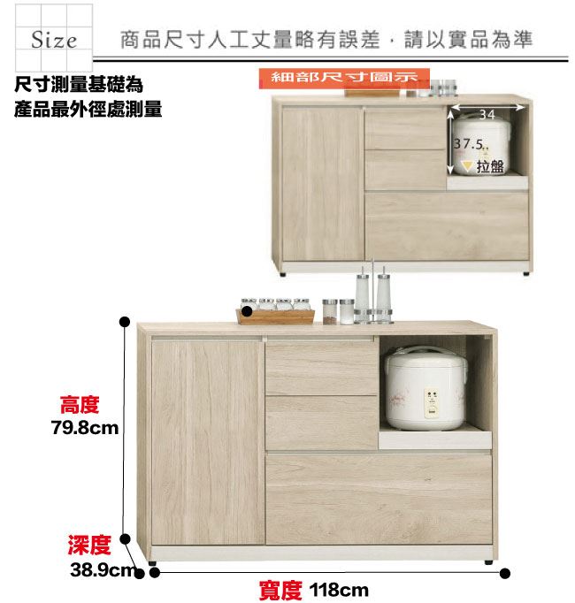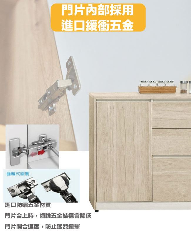 材質 | ◆產品名稱:【綠家居】羅娜3.9尺單門三抽拉盤低餐櫃 餐櫃尺寸:(寬)118x(深)38.9(高)79.8公分 ◆材質: 材質:防蛀木心板+防潮耐磨腳座+防夾手緩衝門片五金+五金滑軌結構 噴漆:防潮耐磨噴漆處理