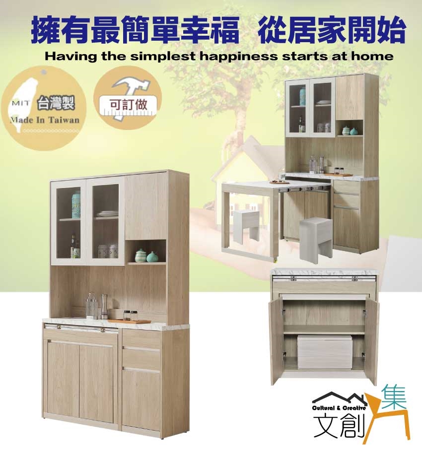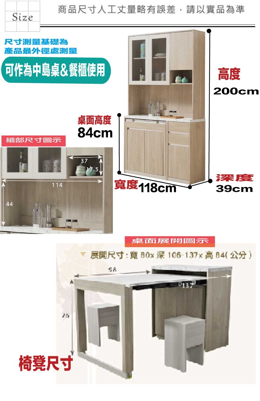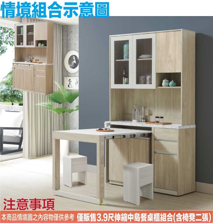 - ◆產品名稱:【綠家居】克利3.9尺可伸縮中島桌高餐櫃組合(附二張椅凳+桌面板可拉合使用)