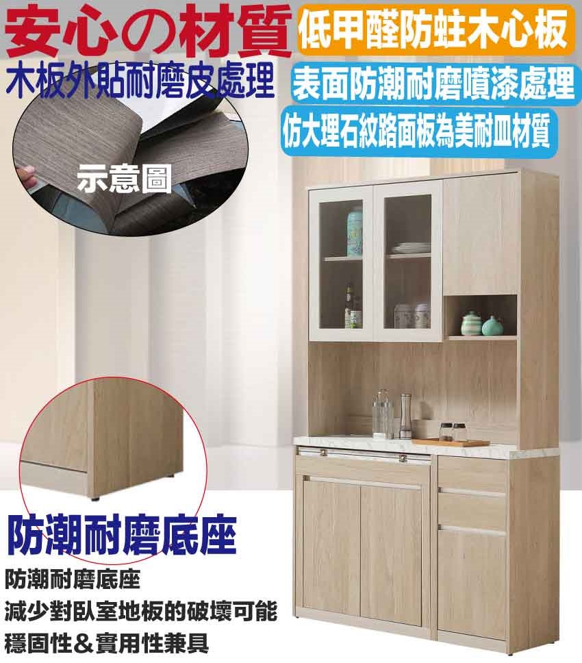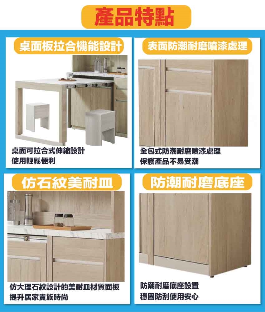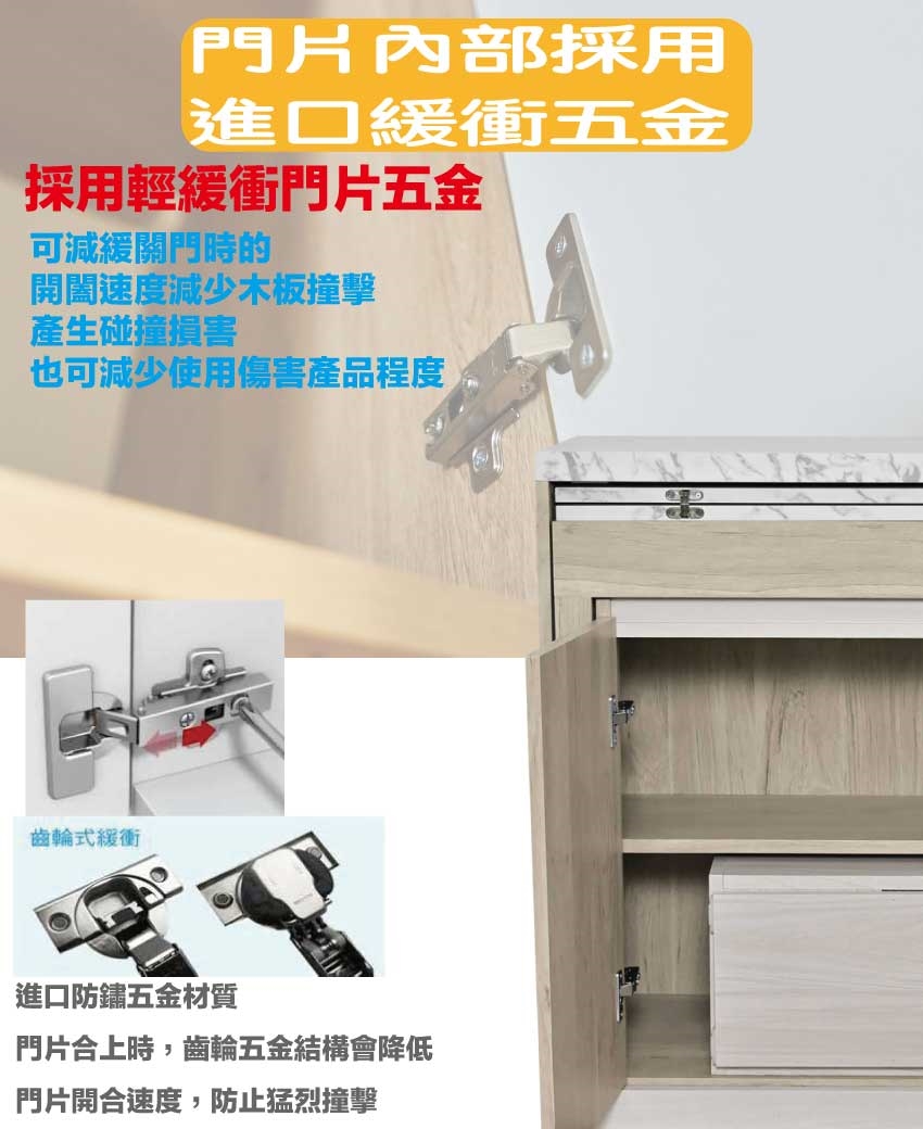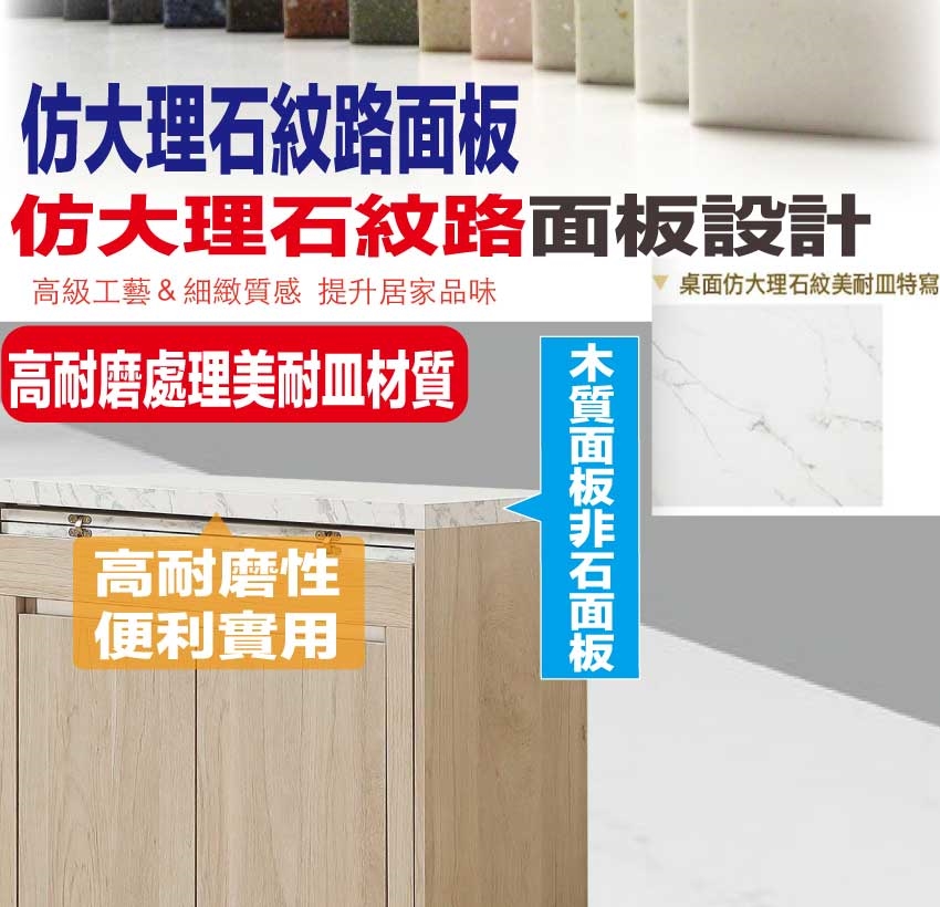 材質:防蛀木心板+防潮耐磨底座+五金滑軌結構+仿大理石紋耐磨美耐皿桌面板+防夾手緩衝門片五金