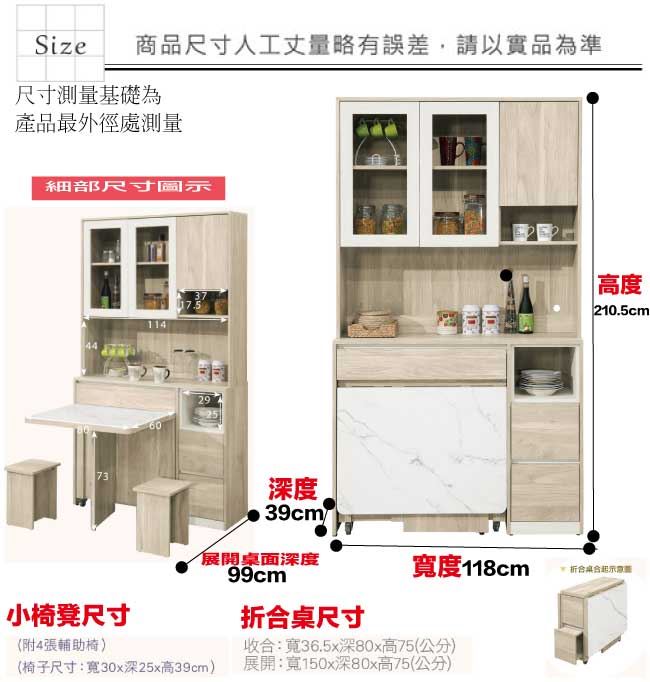 材質 | ◆產品名稱:【綠家居】羅娜3.9尺多功能高餐桌櫃組合(拉合餐桌+餐櫃) 餐櫃尺寸:(寬)118x(深)39(高)210.5公分 折合餐桌(含四張椅凳) 打開尺寸:(寬)36.5x(深)80(高)75公分 收合尺寸:(寬)150x(深)80(高)75公分 ◆材質: 材質:防蛀木心板+防潮耐磨腳座+防夾手緩衝門片五金+五金滑軌結構+仿大理石紋木質桌面板 噴漆:防潮耐磨噴漆處理