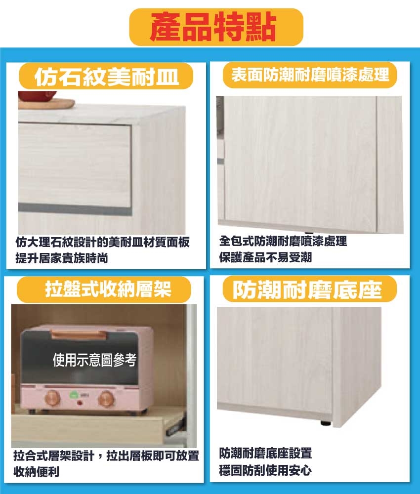 採用防蛀木心板+防潮耐磨底座+防夾手緩衝門片五金+仿石紋耐磨美耐皿桌面板+五金滑軌結構等安心材質製造