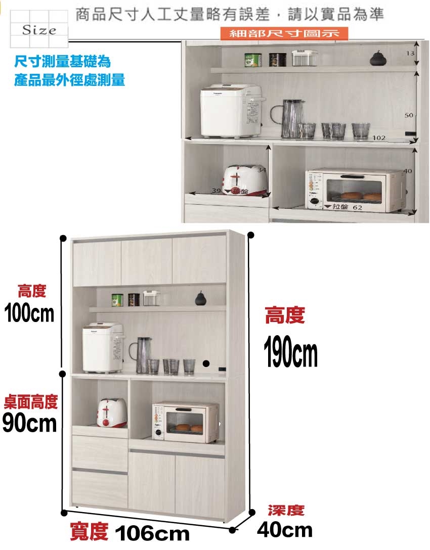 尺寸:(寬)106x(深)40x(高)190/公分 ◆材質: 材質:防蛀木心板+防潮耐磨底座+防夾手緩衝門片五金+仿石紋耐磨美耐皿桌面板+五金滑軌結構 噴漆:防潮耐磨噴漆處理 ◎注意事項: 1.接單後,會有專員與您電聯確認送貨時間。 2.需以吊車吊運以當地吊車行情計,費用由消費者支付。 3.備註:本商品不含圖片上、家飾...等,情境圖之內容僅供參考。 4.請於配送人員到場時,檢查商品有無缺失,以免造成爭議。 5.允許的誤差尺寸範圍+-2%。 6.因拍攝燈光與電腦解析度瑩幕不同可能會造成實品與網頁上商品有些許色差,商品以收到實品為主。 ◎收貨與退貨: 1.實因特殊地型限制及(山區、濱海鄉、鎮、村、區)無法送貨時,本公司保有出貨與否之權利(下單後會由專人告知是否可配送)。 2.有電梯不收取費用! 無電梯樓層超過4樓以上(包含4樓)一樓層費用200元,現場支付給服務員。 3.超過鑑賞期,恕不接受退貨。 4.限非人為因素破壞毀損,才可退貨。 5.若退貨時,收件時間請與廠商協調,確保自己權益。 6.退貨時應保留贈品及附件完整(如有遺失部分,需酌收費用)。 ◎備註: .無回收服務。 .收貨與退貨:實因特殊地型限制及(山區、濱海鄉、鎮、村、區)無法送貨時,本公司保有出貨與否之權利(下單後會由專人告知是否可配送)。 .花蓮(縣市)、台東(縣市)、屏東(縣市場及其它縣市屬於山區、濱海鄉、鎮、村地區無配送服務,如您有需求,則需另外收取運費。(您可直接訂購,後續由廠商報價。) ※由於加價配送服務為一次消耗性商品,若有退換貨等情形加購之運費恕無法退還 ※運費報價皆為單趟計算。 ※使用加價配送地區,收貨時間會比一般地區再增加10個工作天。