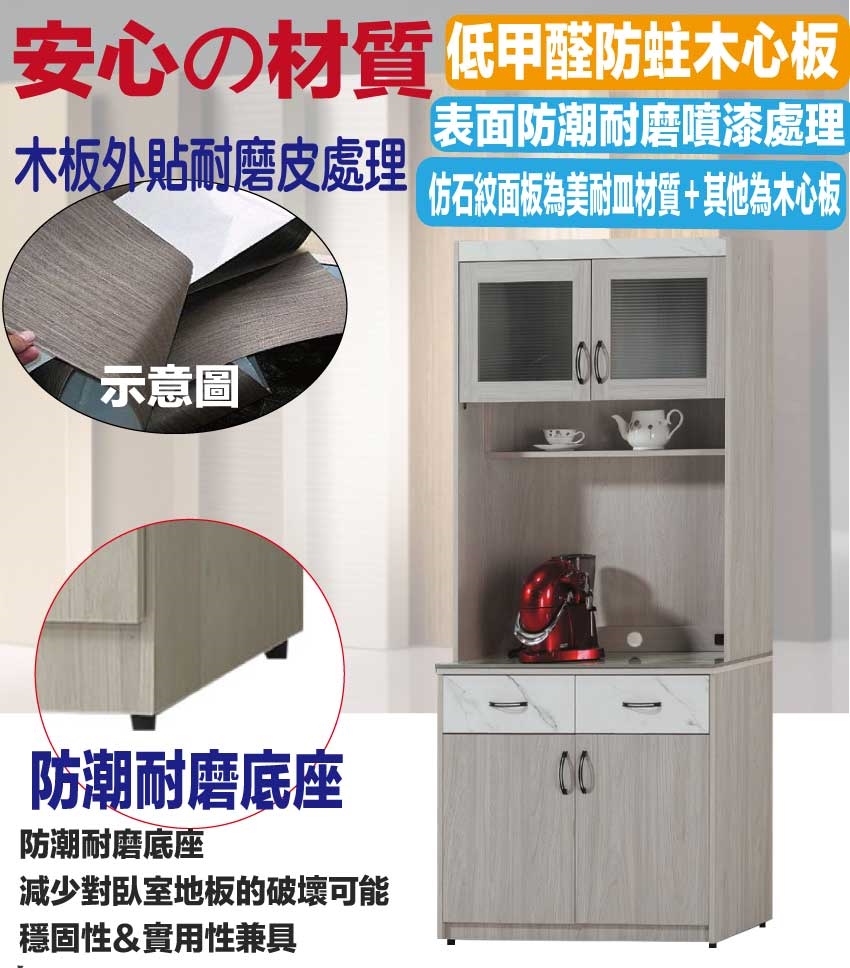 採用防蛀木心板+耐磨美耐皿面板+防潮耐磨底座+防夾手緩衝門片五金+12mm高硬度岩板桌面板+五金滑軌結構等安心材質製造