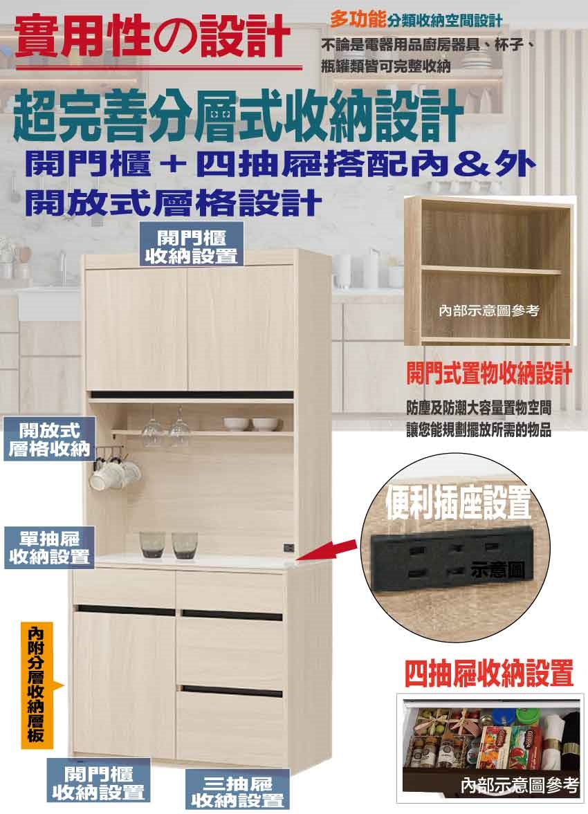 採用開門櫃+四抽屜+內&外開放層格等收納空間設計