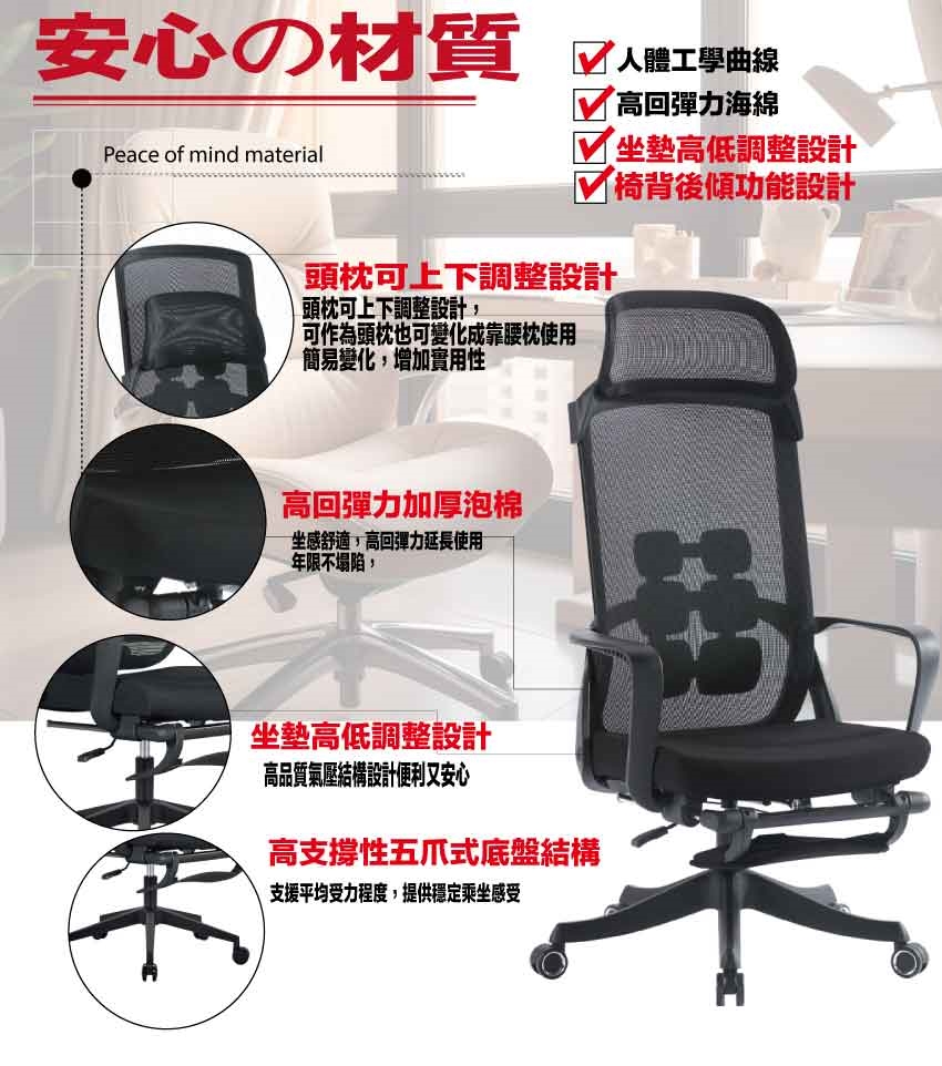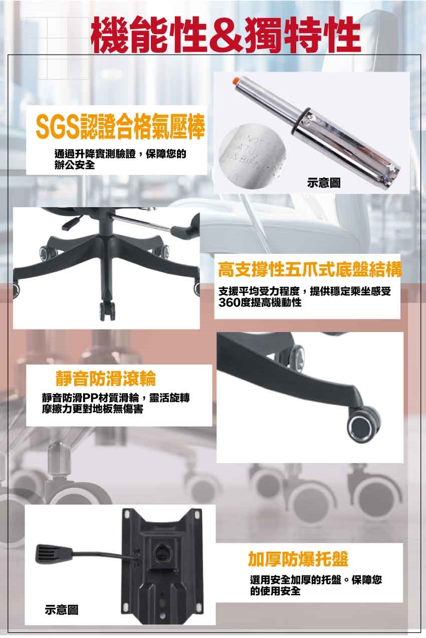 採用高剛性PP材質+高透氣強韌網布+五抓式底盤+防爆托盤架+高磅數氣壓棒+靜音防滑滾輪+高回彈性加厚泡棉等安心材質製造