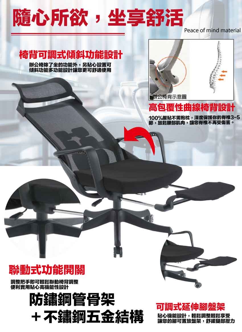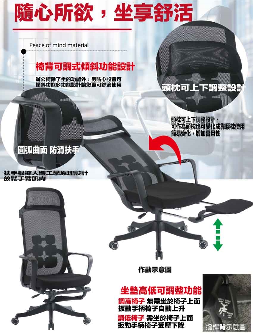辦公椅搭配採用頭枕可變化成護背枕使用+椅背可後仰&坐墊高度調整+連動式伸縮腳靠枕等機能性設計