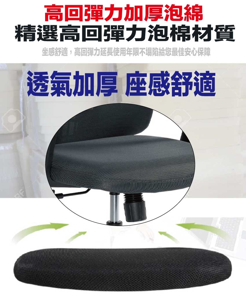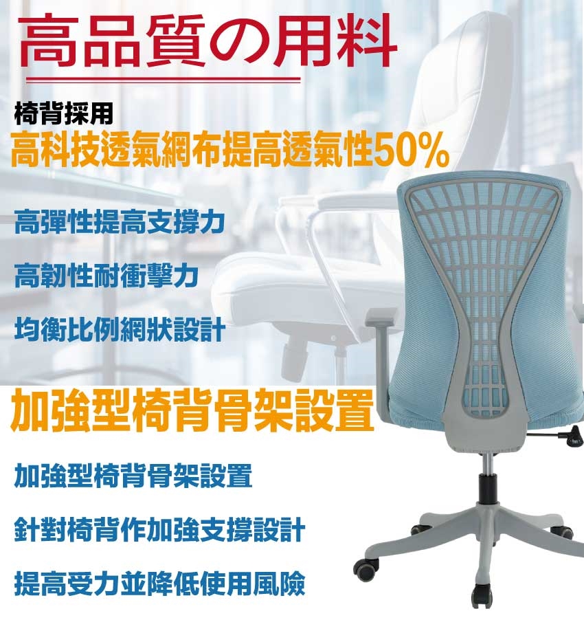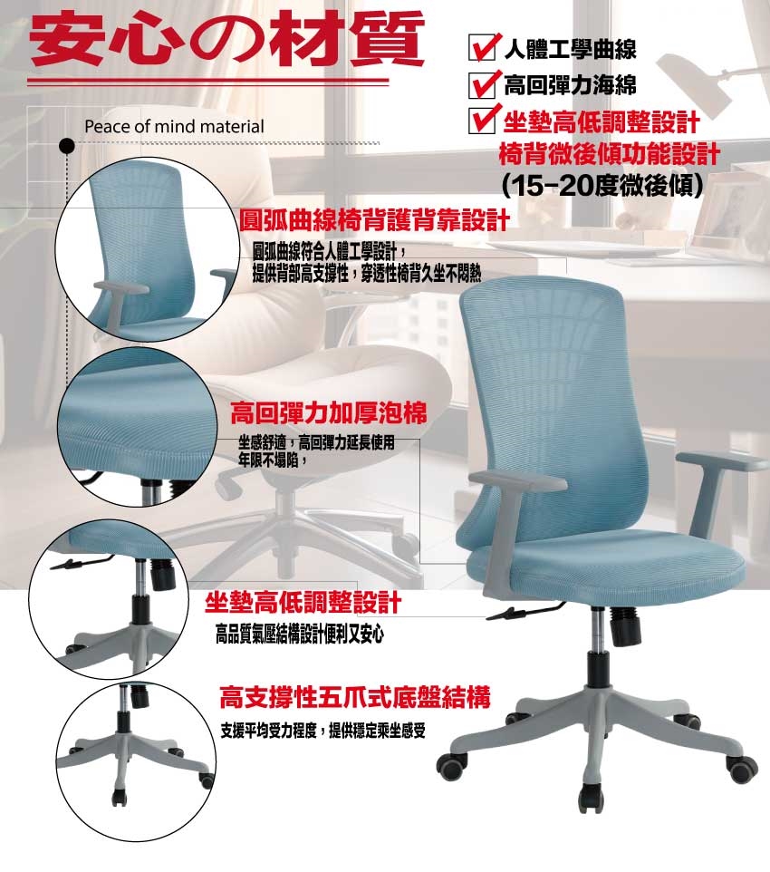 採用高剛性PP材質+高透氣強韌網布+五抓式底盤+防爆托盤架+高磅數氣壓棒+靜音防滑滾輪+高回彈性加厚泡棉等安心材質製造