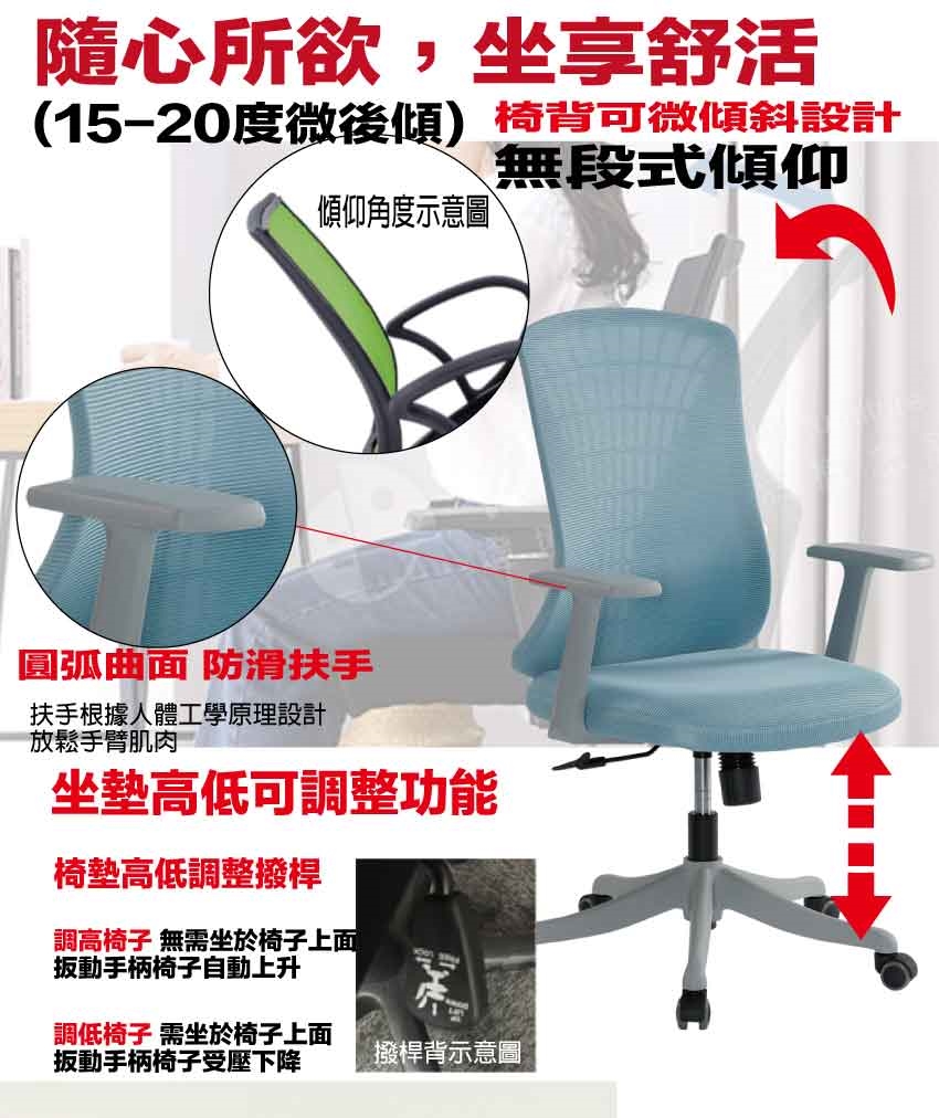 辦公椅搭配採用無段微傾後仰&坐墊高度調整等機能性設計